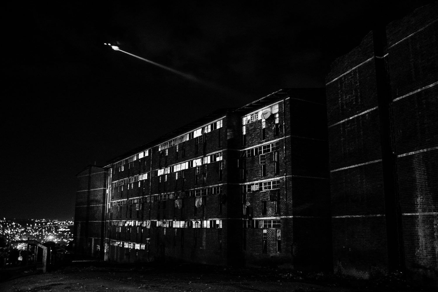 A police helicopter hovers above Madala Men’s Hostel in Alexandra during a late-night raid to search for weapons used in recent attacks. © Alon Skuy