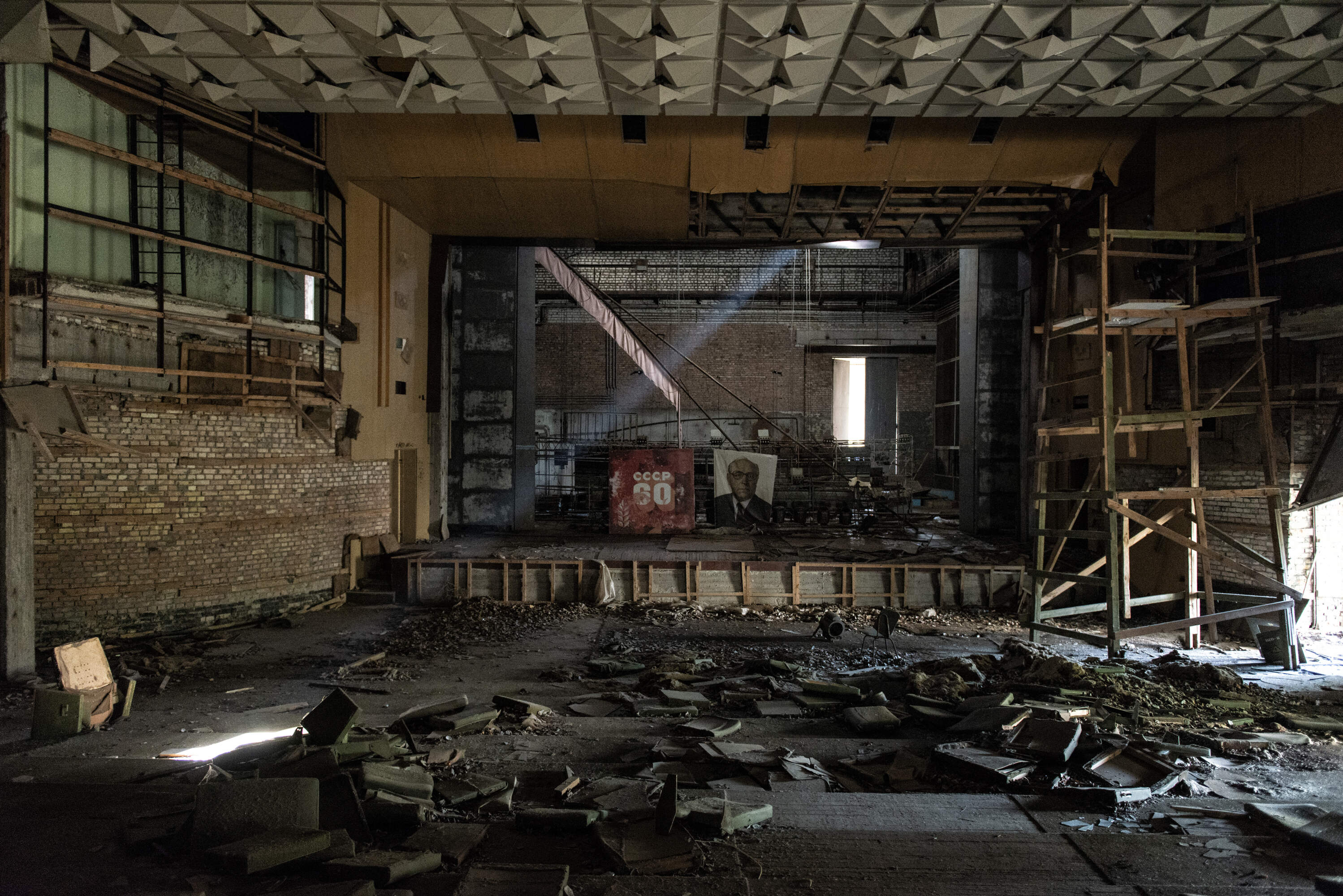 A Soviet-era portrait on the stage of the derelict theatre in the ghost town of Pripyat.