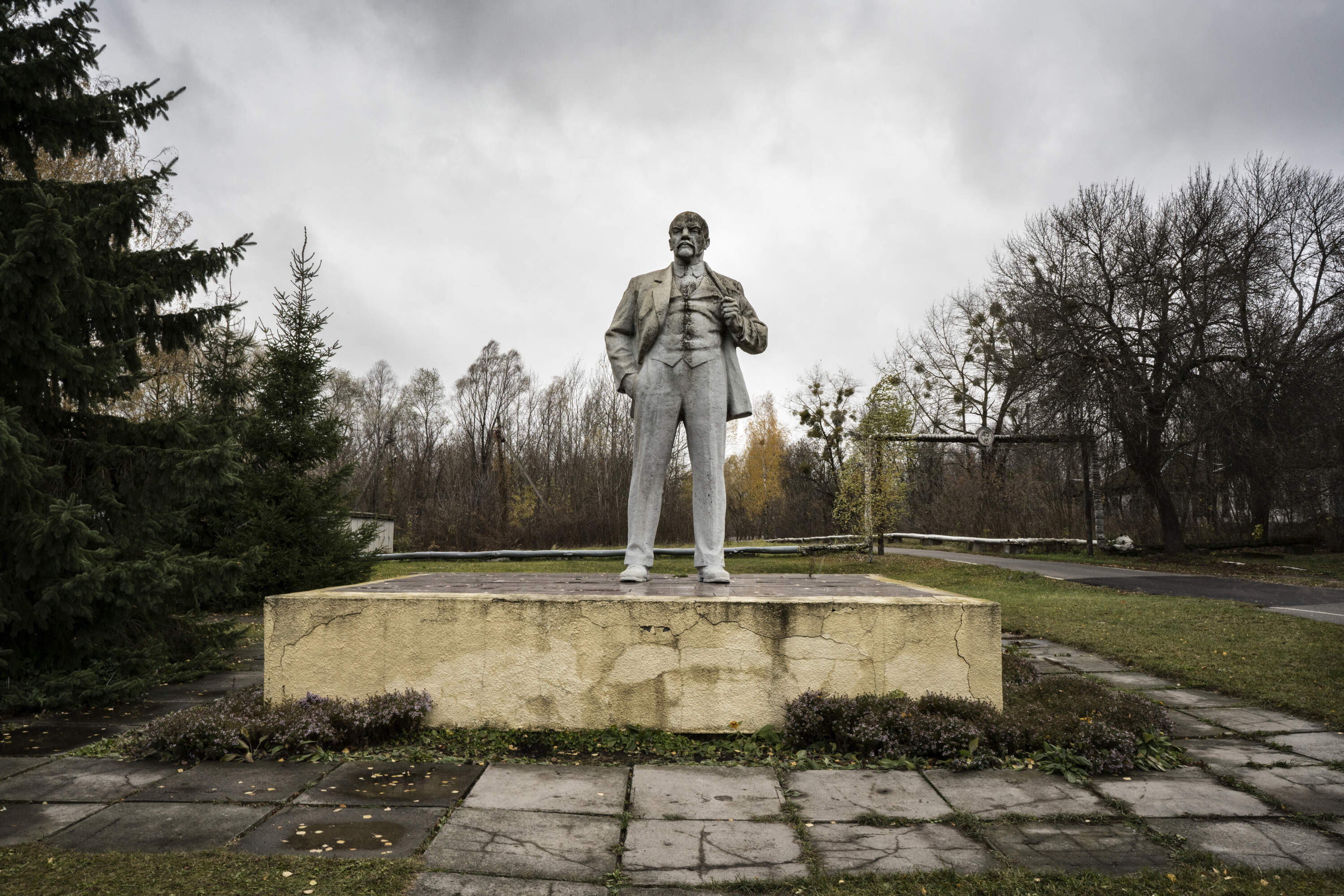 A resident walks through the main square passing the monument of the Third Angel created by the Ukrainian artist Antoly Haidamaka to honor the lives that were lost in the Chernobyl disaster and constructed to commemorate the 25th anniversary of the explosion. (11/2024)