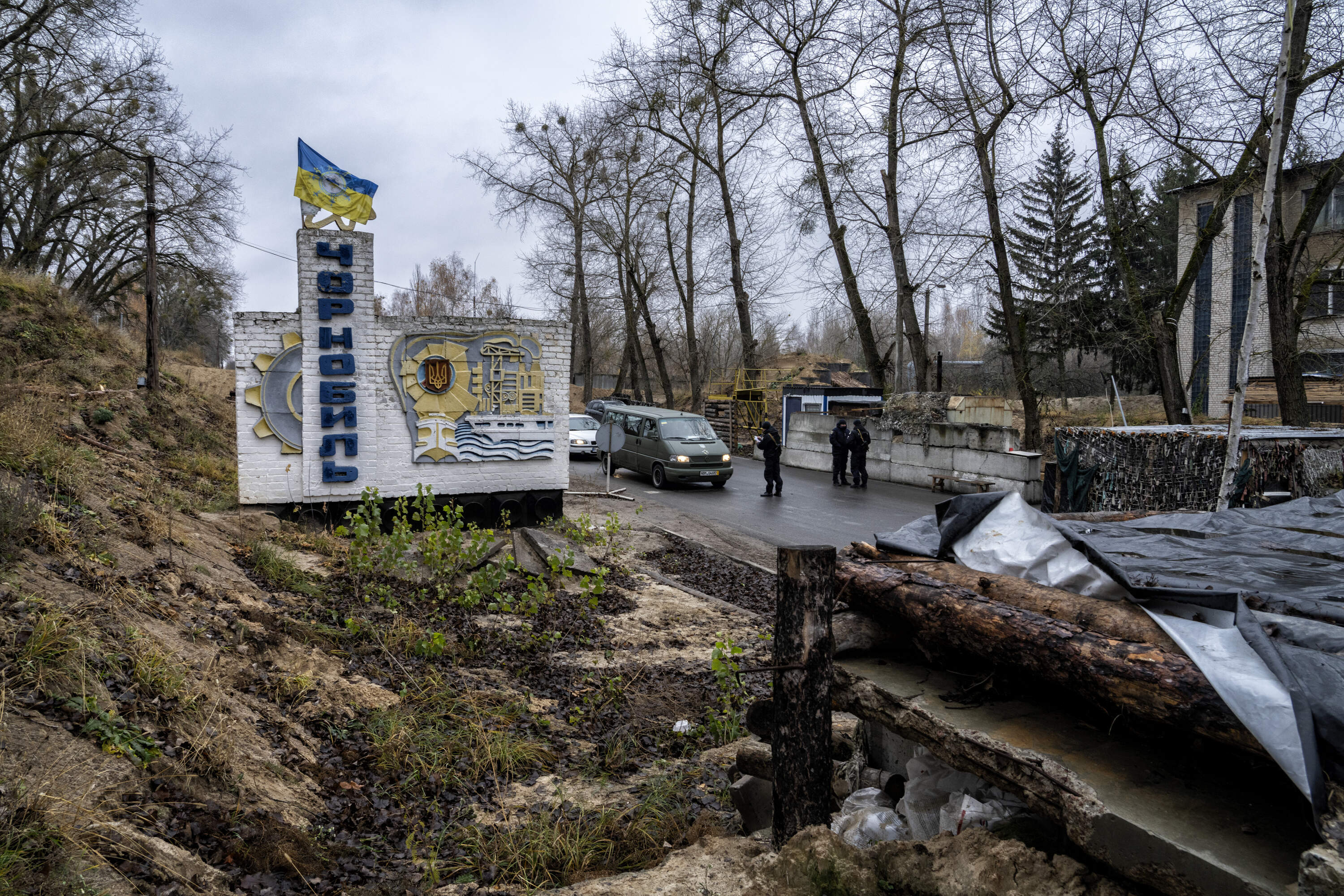Soldiers stop vehicles at a new military check point at the entrance of the city of Chernobyl following the Russian invasion and withdrawal. (11/2024)