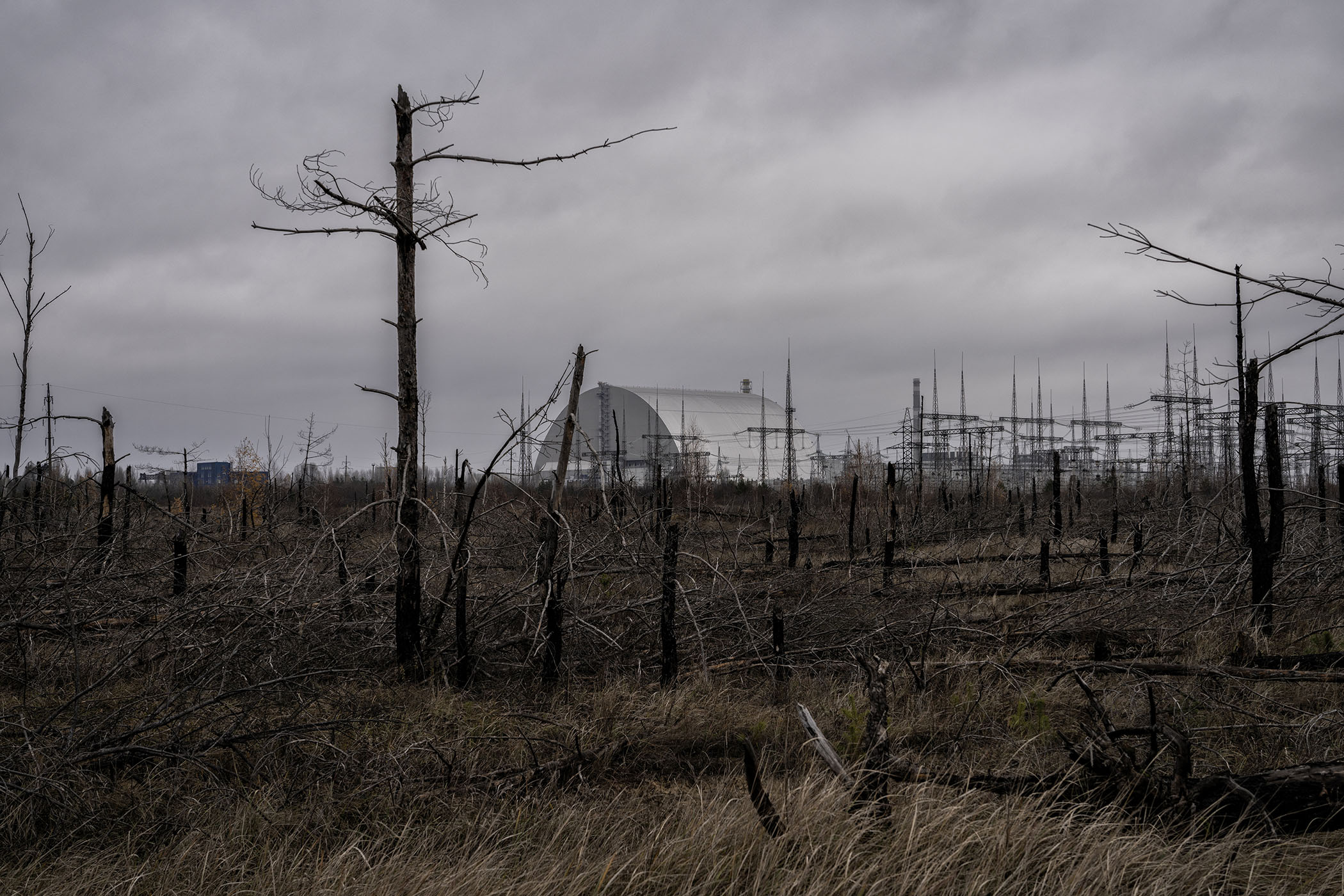 A view through the stumps of a forest, burned by wild fires, to the Chernobyl nuclear power plant and the new confinement sarcophagus that shields reactor number 4. During the Russian occupation in 2022 forest fires were set off by Russian shelling. (11/2024)