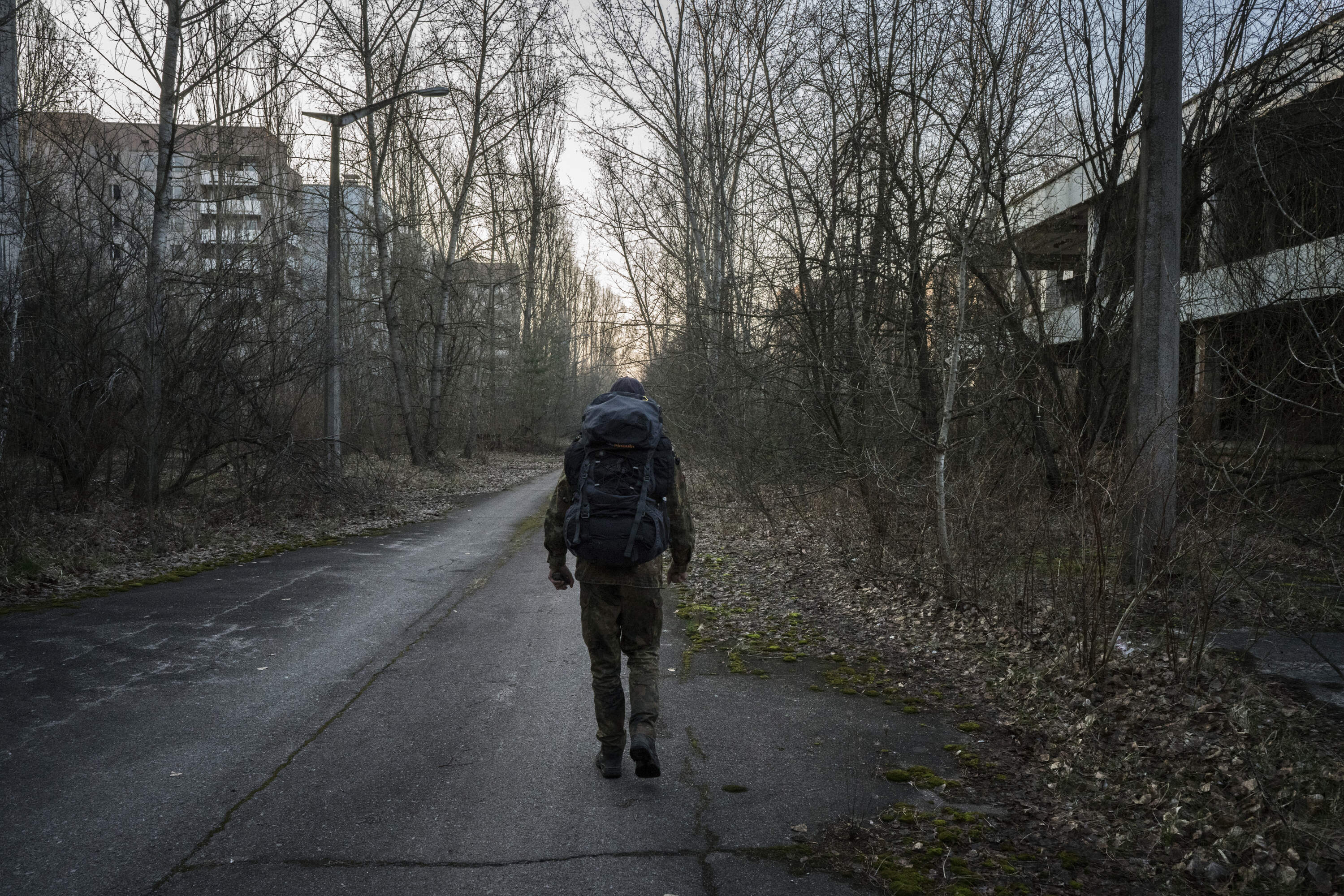 Eugene Knyazev - one of a band of stalkers - walks through the ghost town of Pripyat which he has entered illegally.