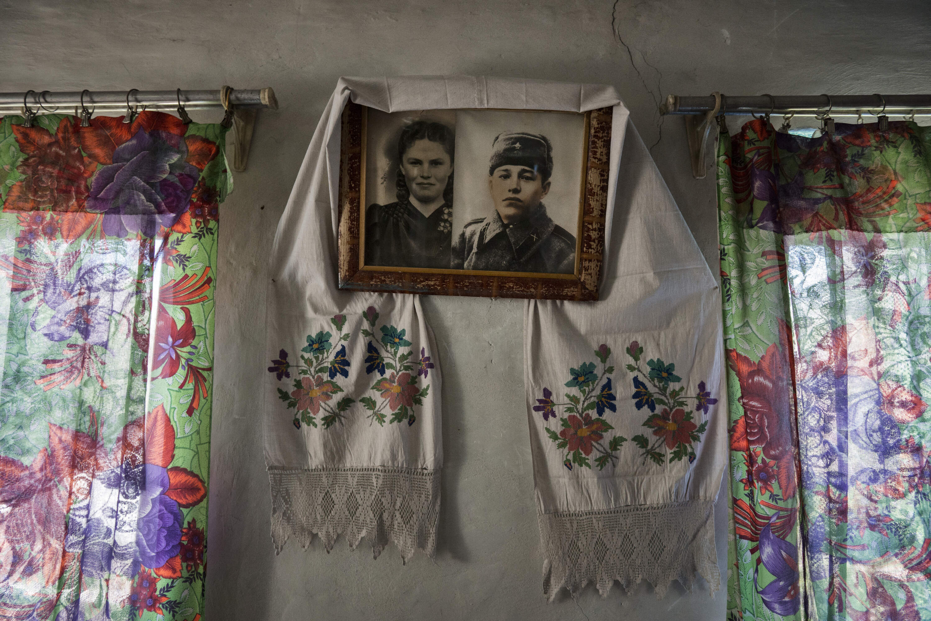 Family photographs on the wall of an abandoned house inside the Chernobyl exclusion zone near the decommissioned nuclear power plant. On 29 April 1986, during a routine safety test, reactor number 4 exploded, releasing high levels of radiation.