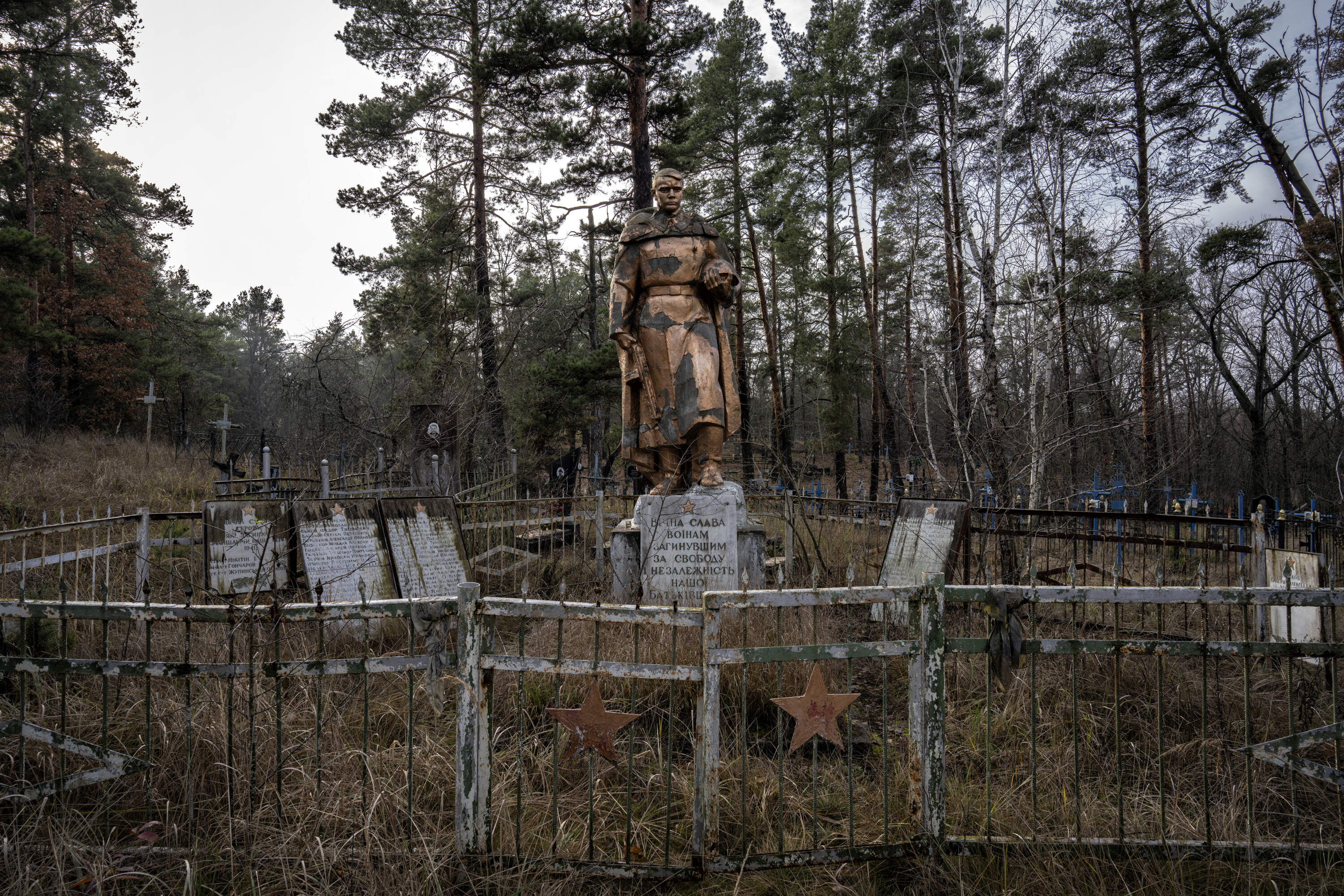 Monument to the fallen soldiers of WW2 in the cemetery of the abandoned village of Kupovate in the Chernobyl exclusion zone. (11/2025)