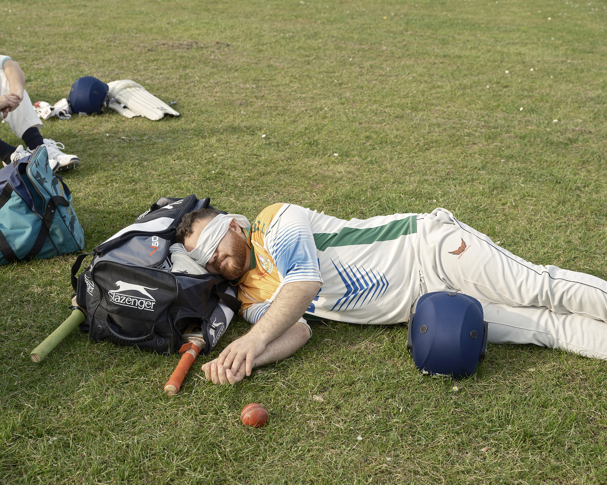 BIRMINGHAM, ENGLAND. A player has a sleep with cloth over his eyes in the Birmingham Cricket League at Perryhall Park This image forms part of the book A Portrait of Cricket by Tom Shaw, a look at grassroots cricket in the UK. For more info - www.tomshawphotography.com/portrait-of-cricket