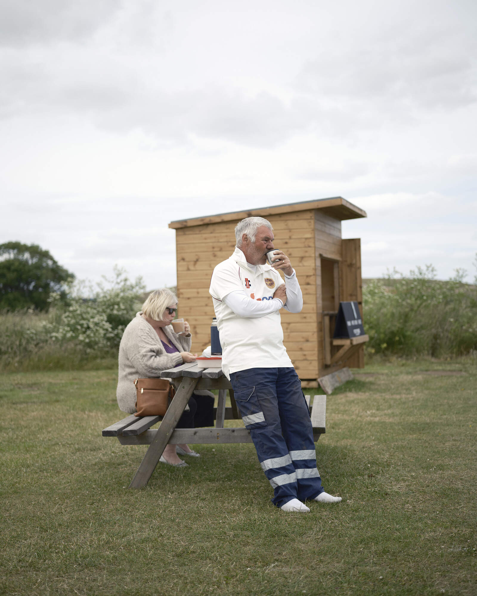 HARTLEPOOL, ENGLAND. A player enjoys a cup of tea while waiitng to play at Hartlepool Power Station Cricket Club