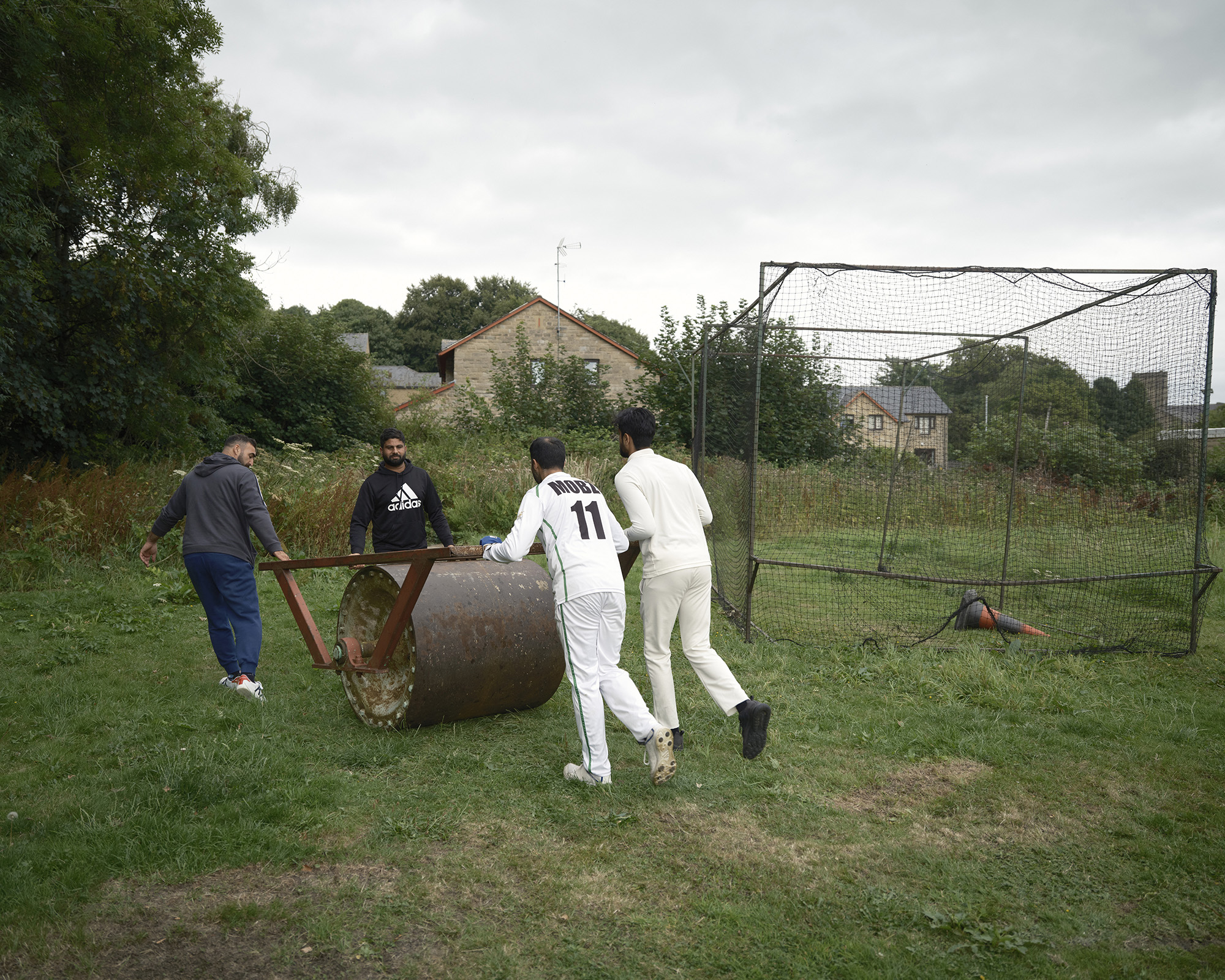 GREETLAND, ENGLAND. Players move the heavy roller after rolling the pitch at Greetland Cricket Club