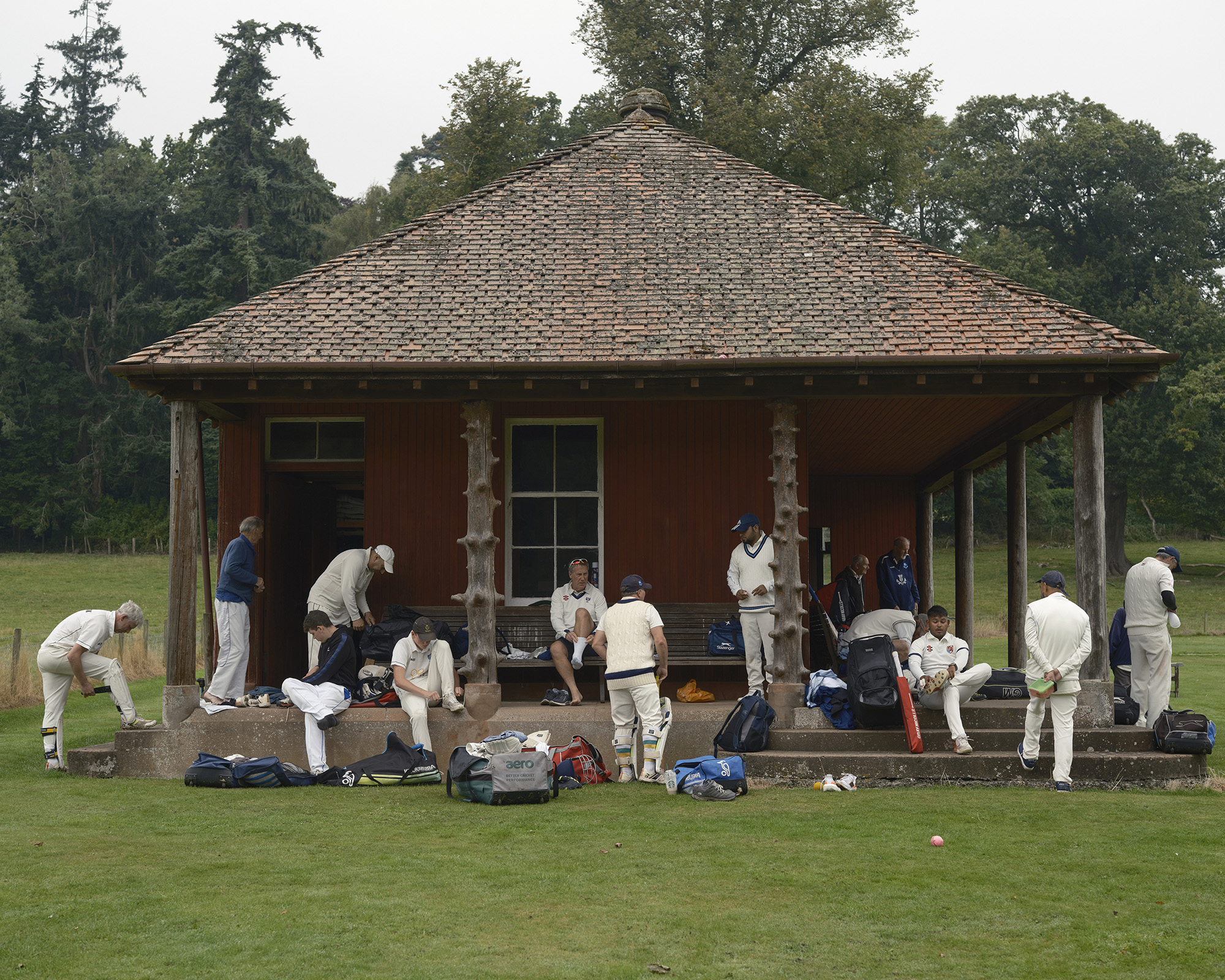 INCHTURE, SCOTLAND. Players get ready at the club house at Rossie Priory Cricket Club