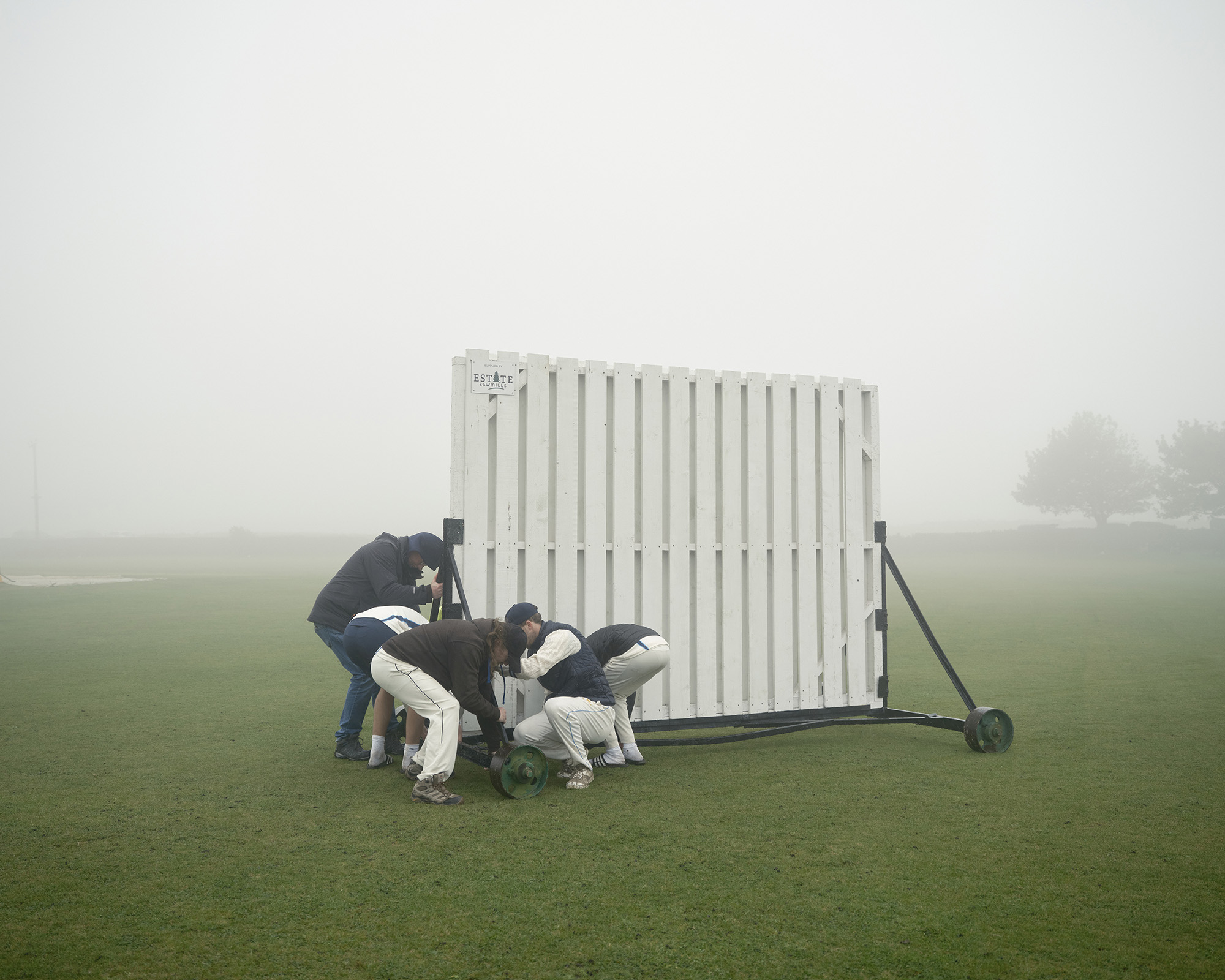 QUEENSBURY, ENGLAND Players moving the sightscreen at Queensbury Cricket Club in thick fog