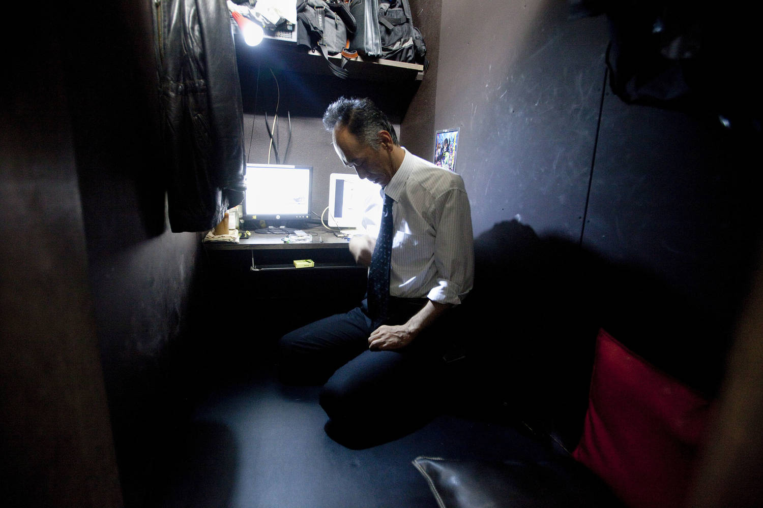 After Mr Sakai quit his salaryman position, he moved to an internet cafe where he now works as telephone operator and temps for a friend’s computer systems company. Even though living in a bath tub-sized booth is his new reality, Mr. Sakai swears he is much happier now.