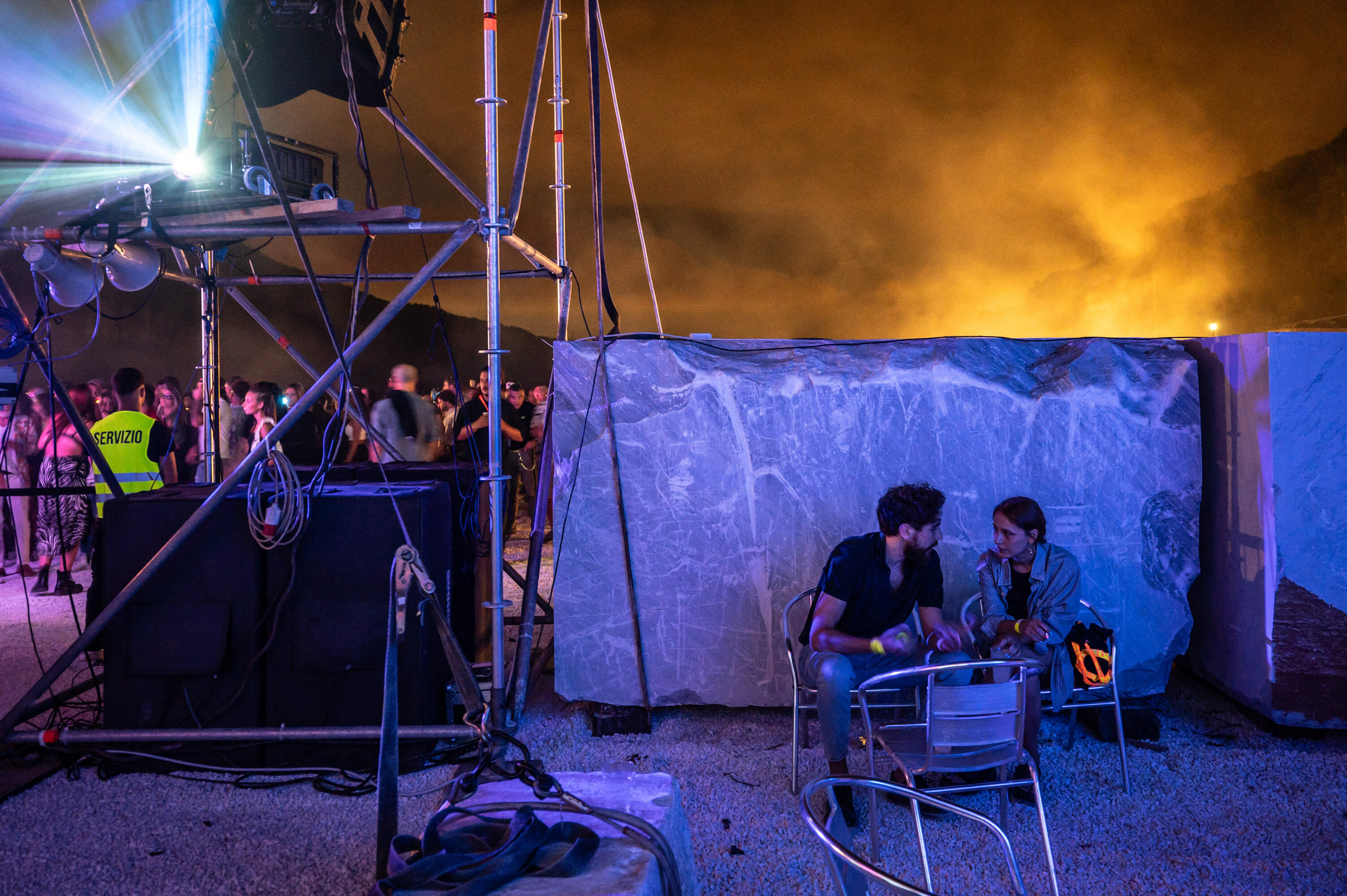 Italy. Guests at the Vox Marmoris event, a summer evening of performance art and house and disco music concerts organised among the Corsi family's white marble blocks.