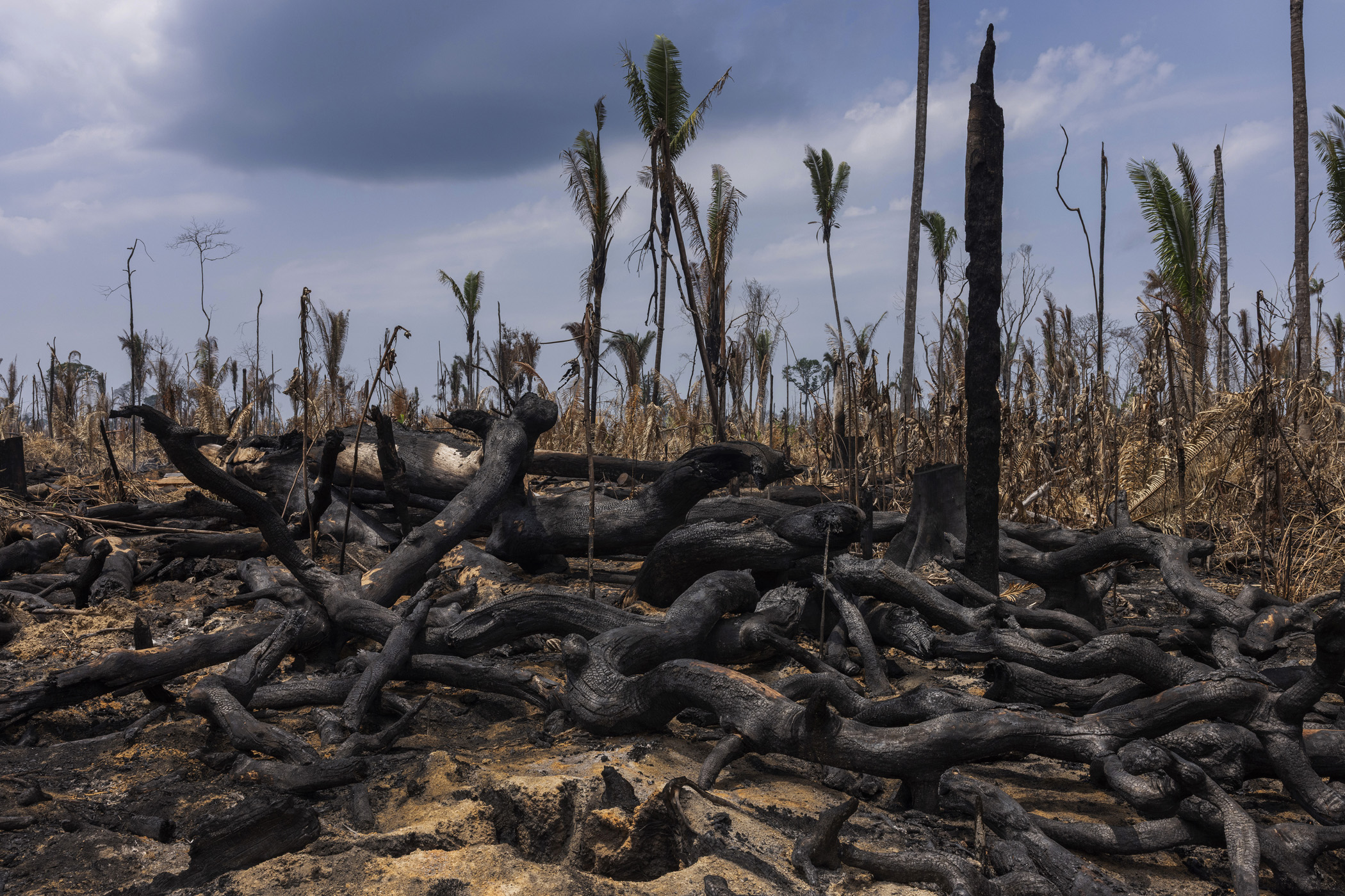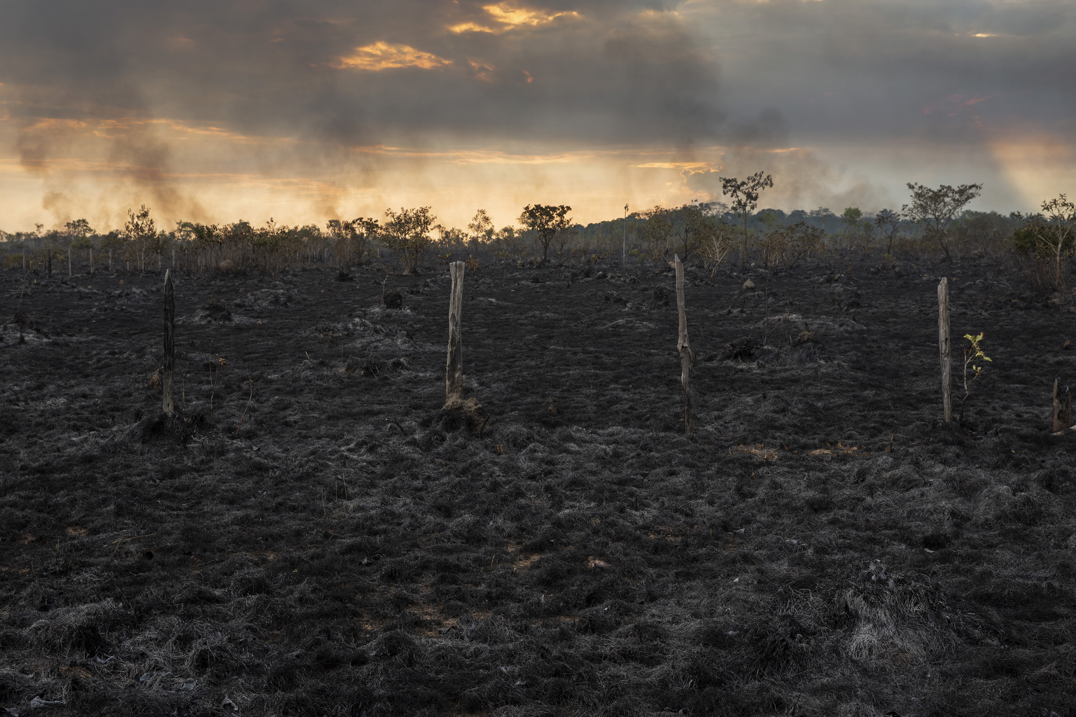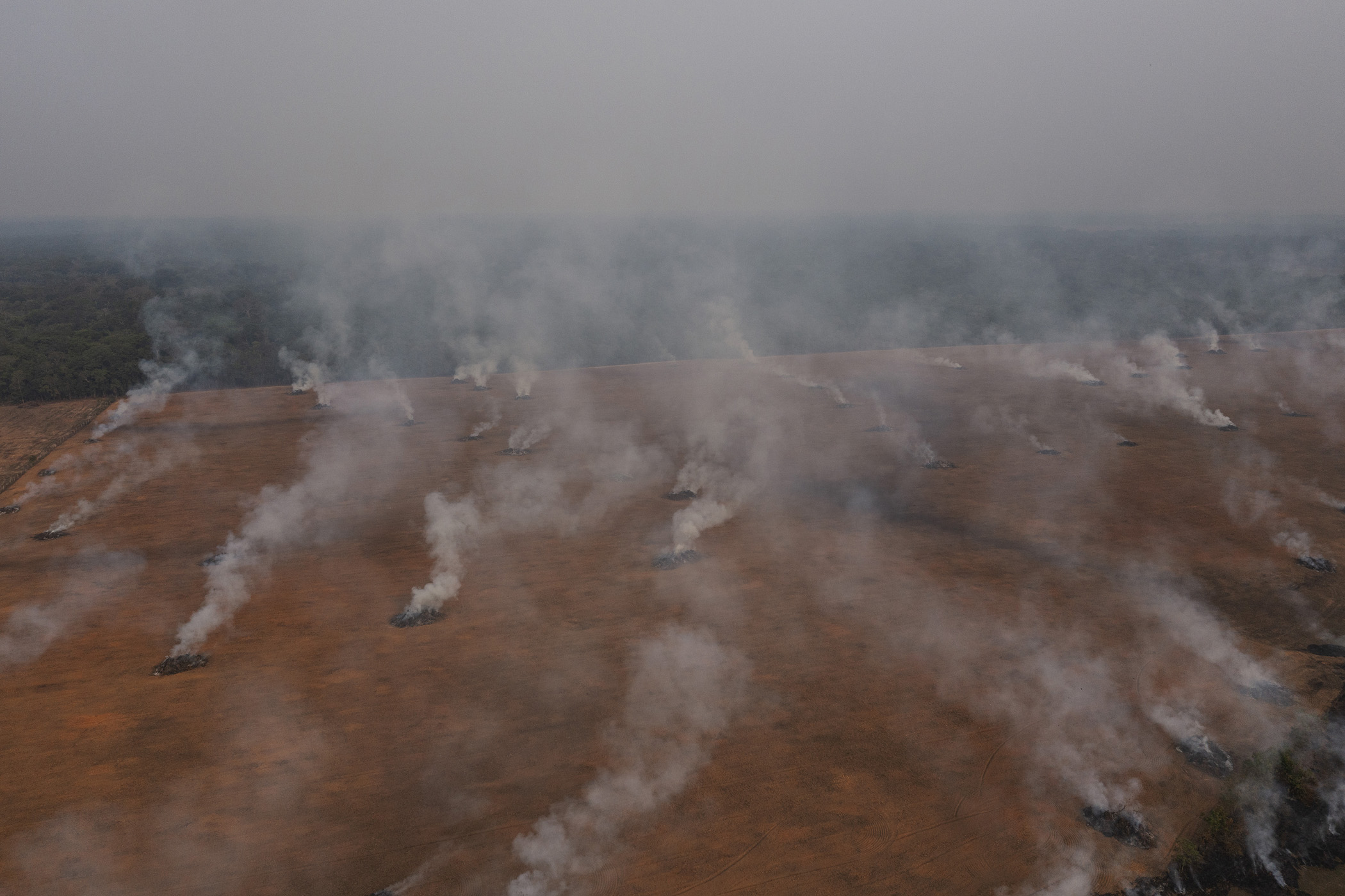 Humaitá, Brazil. Tree rows are burned in a deforested area near the junction of the BR-319 and Trans-Amazonian highways, close to Humaitá, in southern Amazonas. The opening up of new areas for soybean cultivation has been one of the drivers of deforestation in this region.