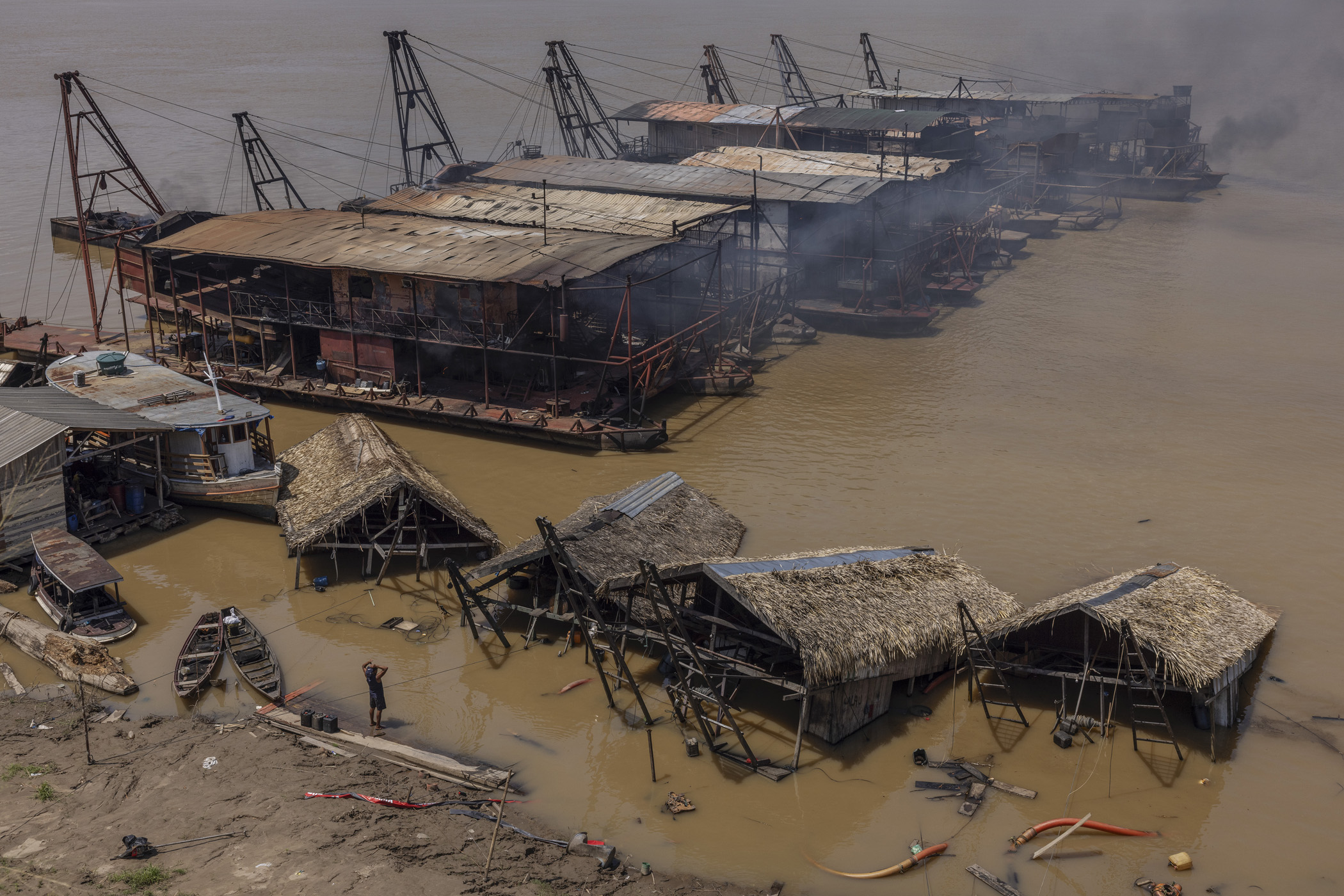 Humaitá, Brazil. September 15, 2025. Gold miners observe destroyed mining rafts on the banks of Humaitá, in southern Amazonas, during a Federal Police operation to combat illegal gold mining on the Madeira River. The city of Humaitá is located at the intersection of two important Amazonian roads, BR-319 and Trans-Amazonian highway.