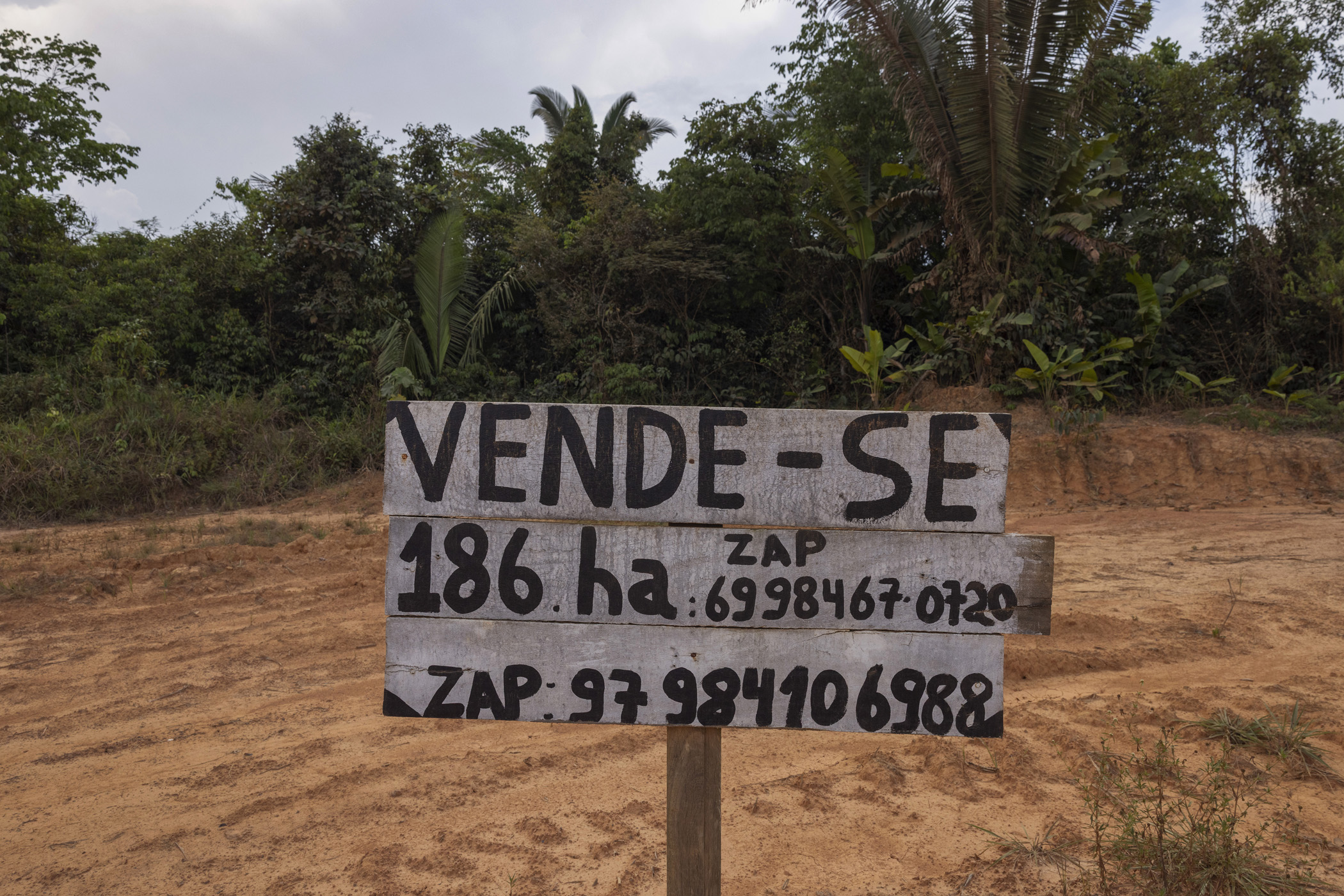 Humaitá, Brasil. September 12, 2025. Sign advertising the sale of land along the BR-319 highway near the district of Realidade, in Humaitá, southern Amazonas. The prospect of the BR-319 being paved has fueled illegal land sales, land grabbing, and increased deforestation rates.