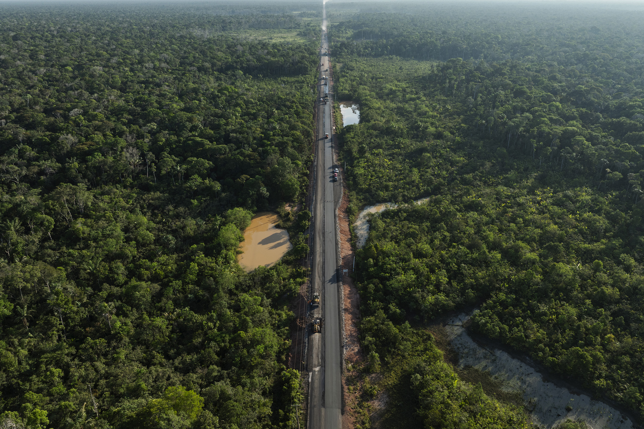Humaitá, Brazil. September 11, 2025. Workers pave the BR-319 highway between the city of Careiro and the community of Igapó Açú, in Amazonas. The highway, which connects the cities of Manaus and Porto Velho, crosses one of the most preserved areas of the Amazon, and its paving could have tragic effects on the forest and traditional communities.