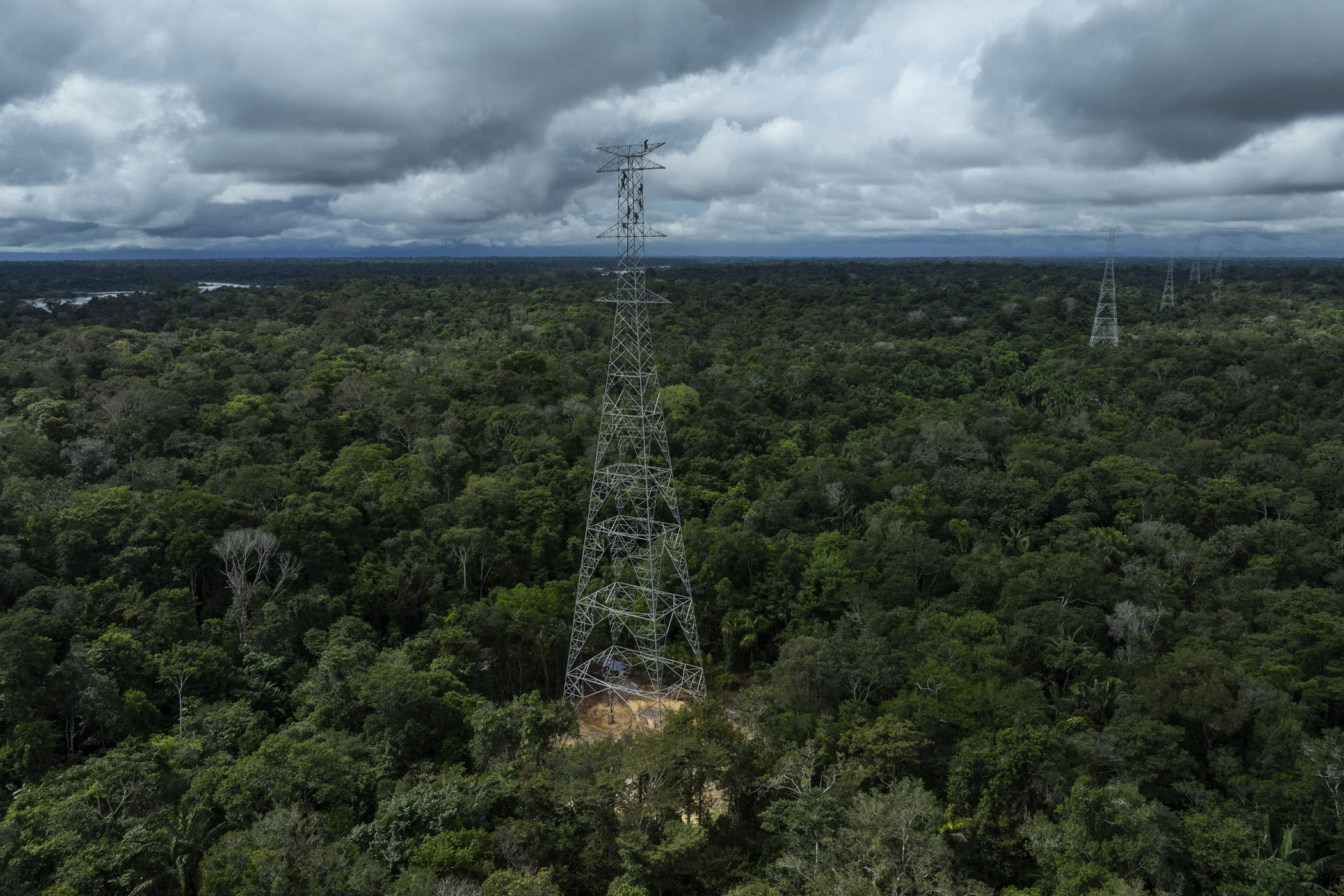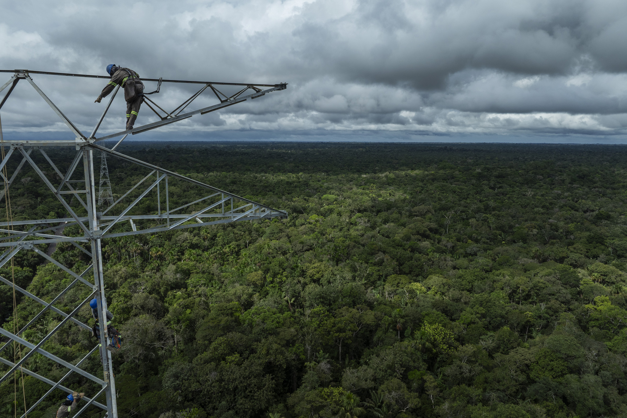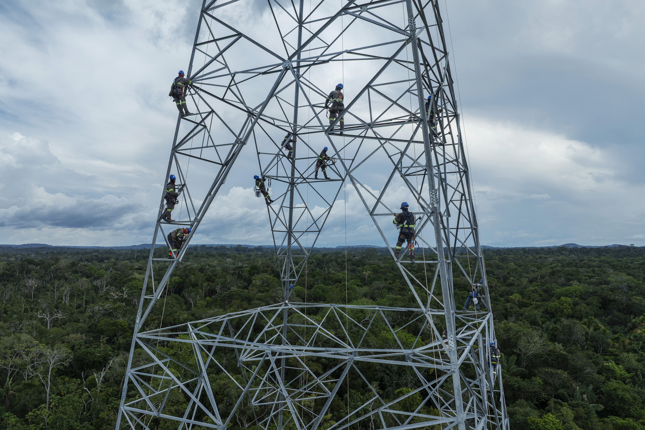 Presidente Figueiredo, Brazil. June 12, 2025. Workers assemble a tower for the Manaus - Boa Vista power line within the Waimiri Atroari Indigenous Territory, in the state of Amazonas. During the Brazilian military dictatorship (1964 to 1985), large-scale projects were carried out within the territory without any consultation with the Indigenous people, causing a drastic reduction in the Waimiri-Atroari population. A road tore through the territory, a hydroelectric dam flooded part of the forest, and a mining company polluted the rivers that flow through the villages. Only during the construction of the BR-174 highway in the 1970s, which cuts through their traditional territory to connect Manaus to Boa Vista, did the Kinja (as they call themselves) population decrease from 1,500 to 374 Indigenous people. Now, during the construction of the power line, a decisive change has occurred in the way a project of this size is executed within a recently contacted Indigenous territory: the Kinja have taken a leading role in overseeing the works. This model has not been seen in other large projects in the Amazon.