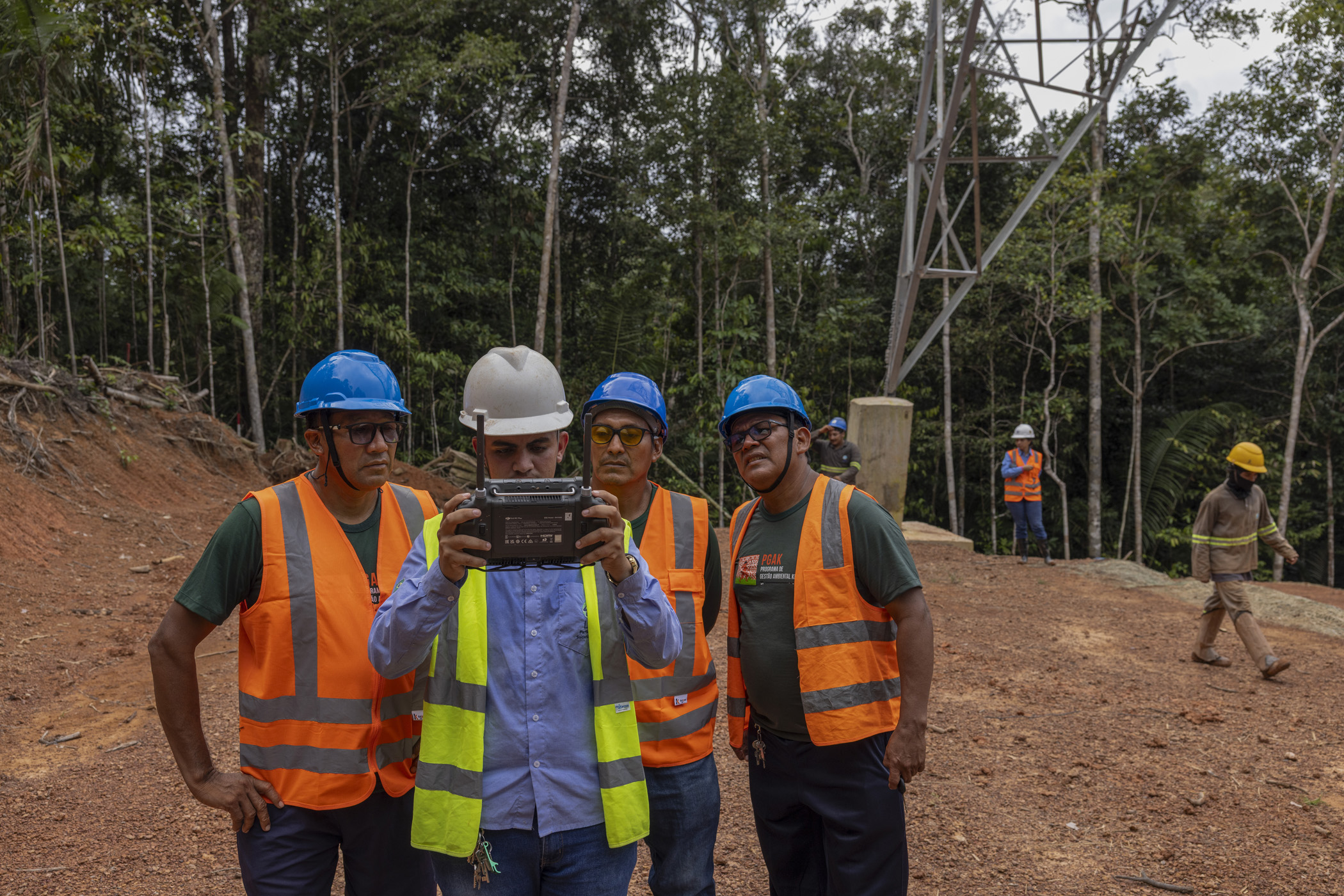 Rorainópolis, Brazil. June 13, 2025. Sawa Aldo Waimiri, Sanapyty Geroncio Atroari and Ewepe Marcelo Atroari, leaders of the Kinja Environmental Management Programme (PGAK), watch an operator use a drone to lay a cable at the Manaus-Boa Vista power line construction site in the Waimiri Atroari Indigenous Territory in Roraima. This is the first time that this model of monitoring a large construction project in the Amazon has been carried out by recently contacted indigenous peoples.