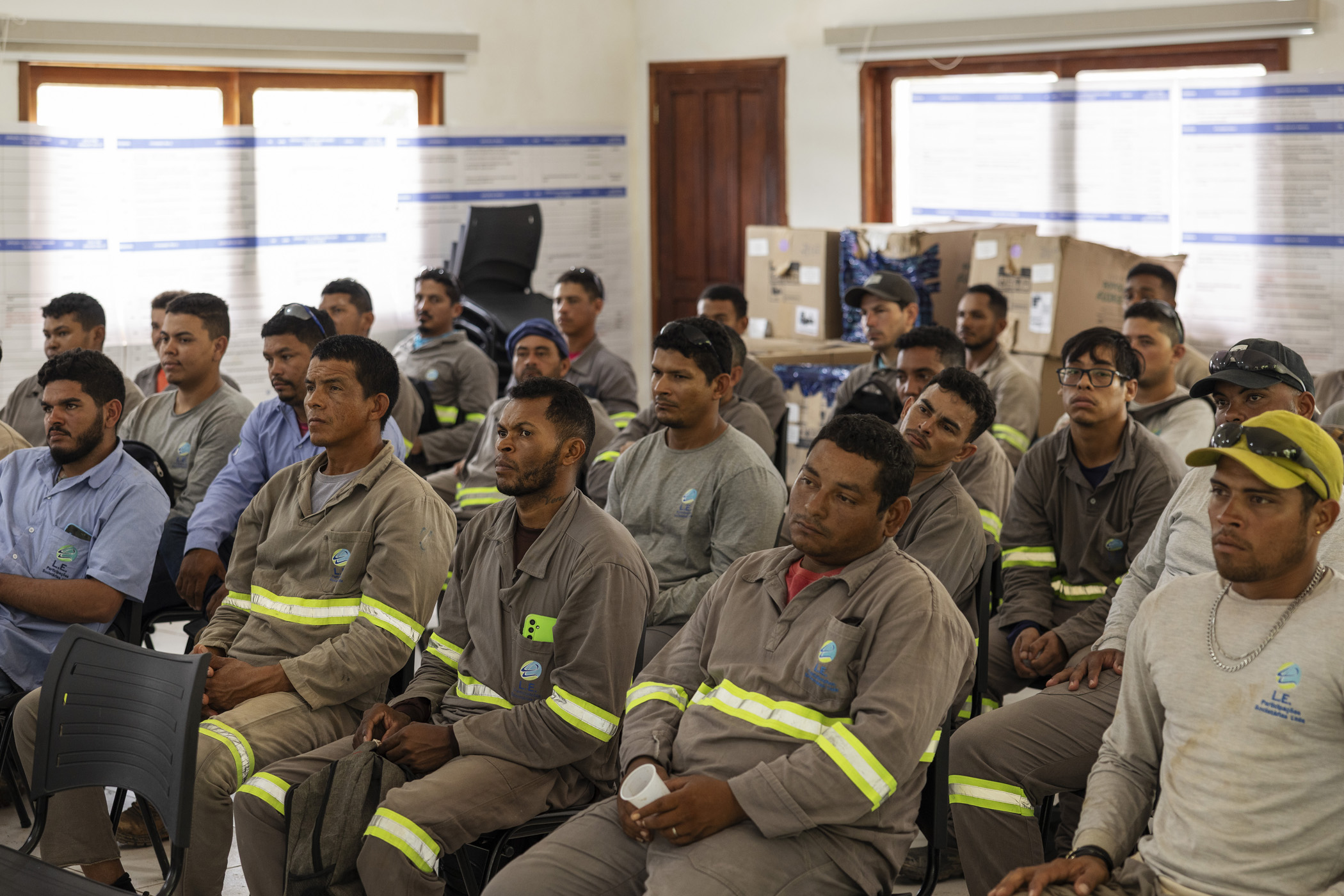 Presidente Figueiredo, Brazil. June 13, 2025. Workers on the Manaus-Boa Vista power line attend an integration lecture at the Kinja Environmental Management Centre (PGAK) in the Waimiri Atroari Indigenous Territory, in Amazonas. The purpose of this training is to instruct workers on the rules for working within indigenous land.