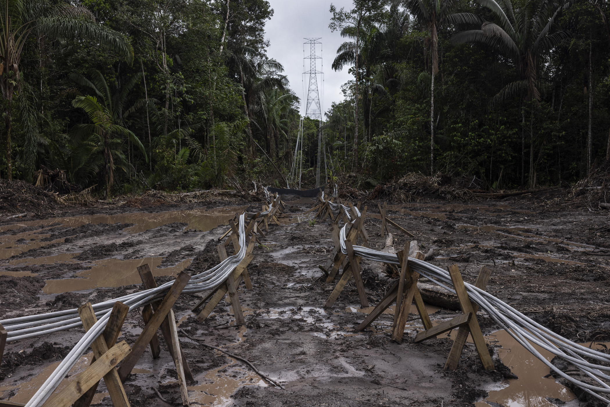 Rorainópolis, Brazil. June 13, 2025. Cable launching area at the Manaus - Boa Vista power line construction site, within the Waimiri Atroari Indigenous Territory, in Roraima. During the construction of the power line a decisive change has occurred in the way a project of this size is executed in the Amazon within a recently contacted Indigenous territory: the Kinja ( as they call themselves ) have taken a leading role in overseeing the works. This model has not been seen in other large projects in the Amazon.