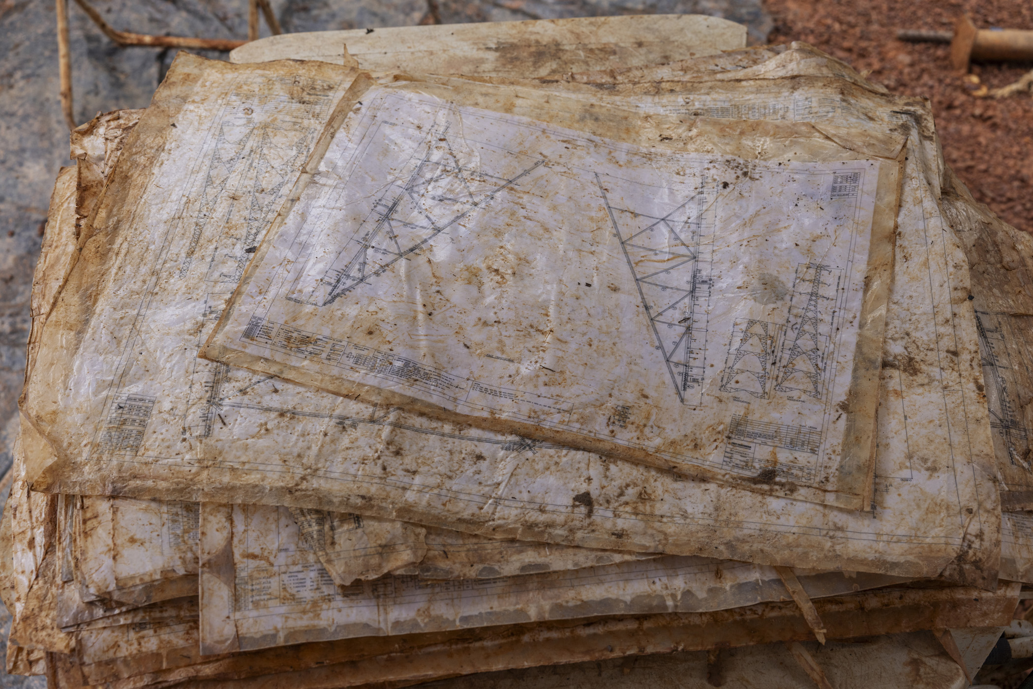 Presidente Figueiredo, Brazil. June 12, 2025. Construction drawings for towers on the Manaus-Boa Vista power line, being used on a construction site within the Waimiri Atroari Indigenous Territory in Amazonas.