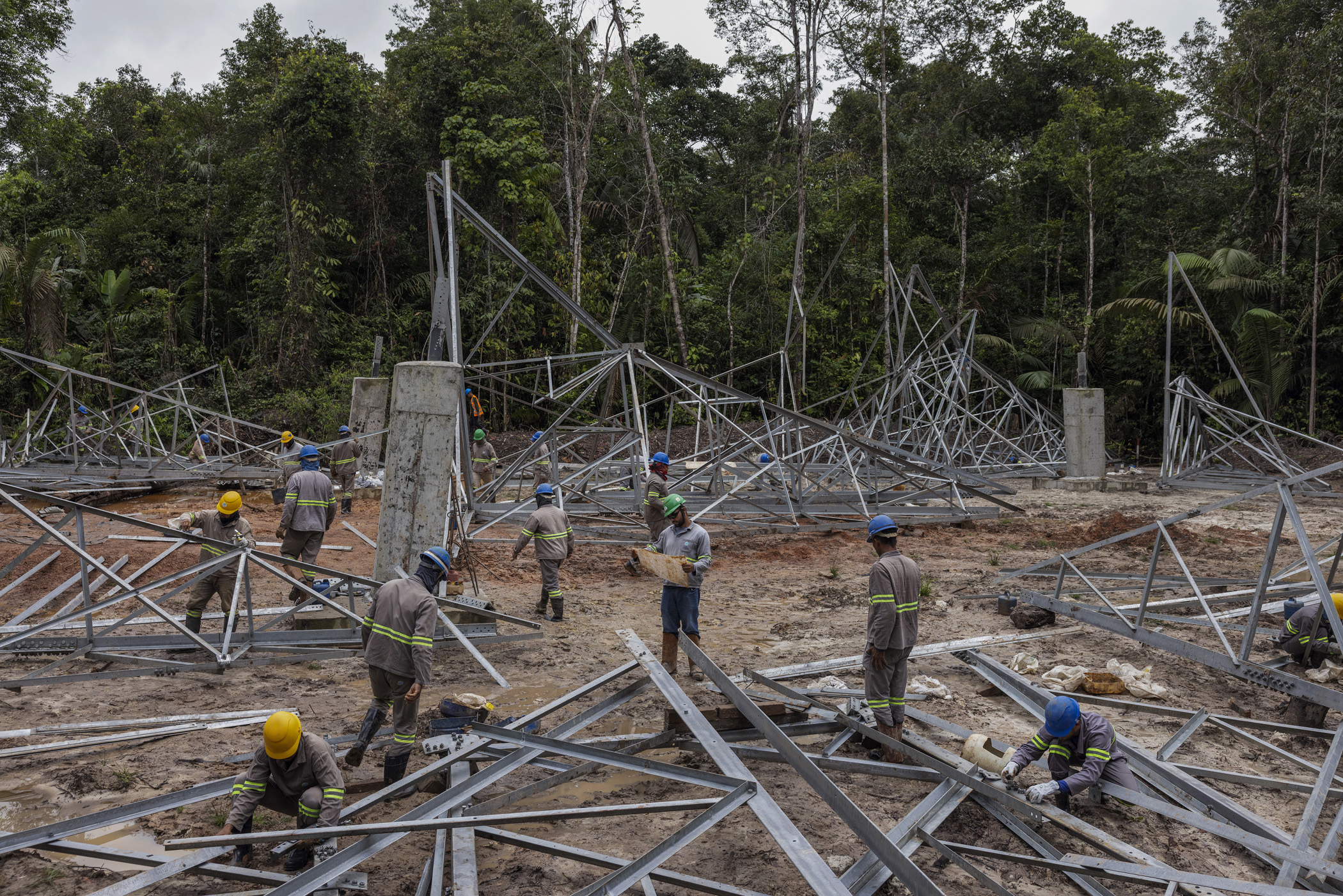 Presidente Figueiredo, Brazil. June 12, 2025. Workers assemble a tower for the Manaus-Boa Vista power line within the Waimiri Atroari Indigenous Territory in Amazonas. As with all major projects in the Amazon, most of the workers who built the power line come from the poorest states in Notheastern Brazil, such as Maranhão and Piauí.