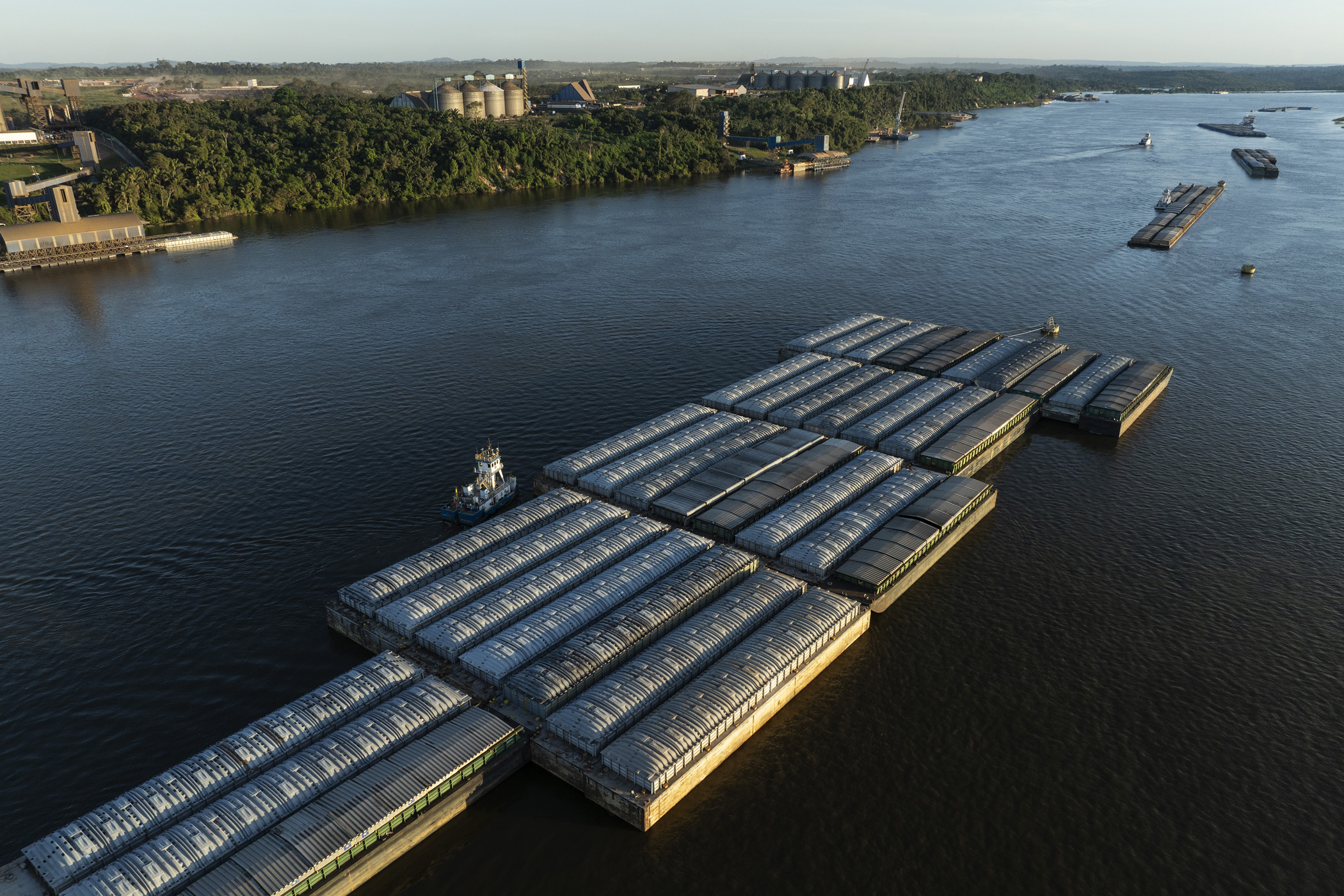 Itaituba, Brazil. May 04, 2025. Barges used to transport grain on the Tapajós River are anchored in front of Miritituba, near the city of Itaituba in Pará, Brazil. Miritituba will be the final stop of the Ferrogrão railroad, which will be used to transport grain from Mato Grosso, the country's main soybean-producing region, to the Tapajós River.