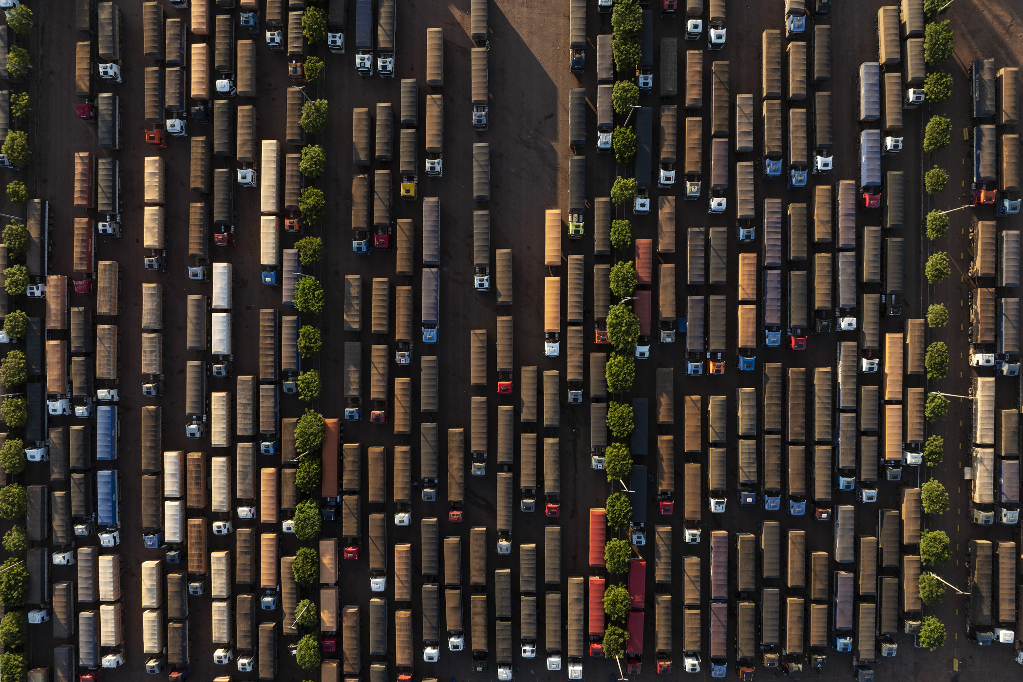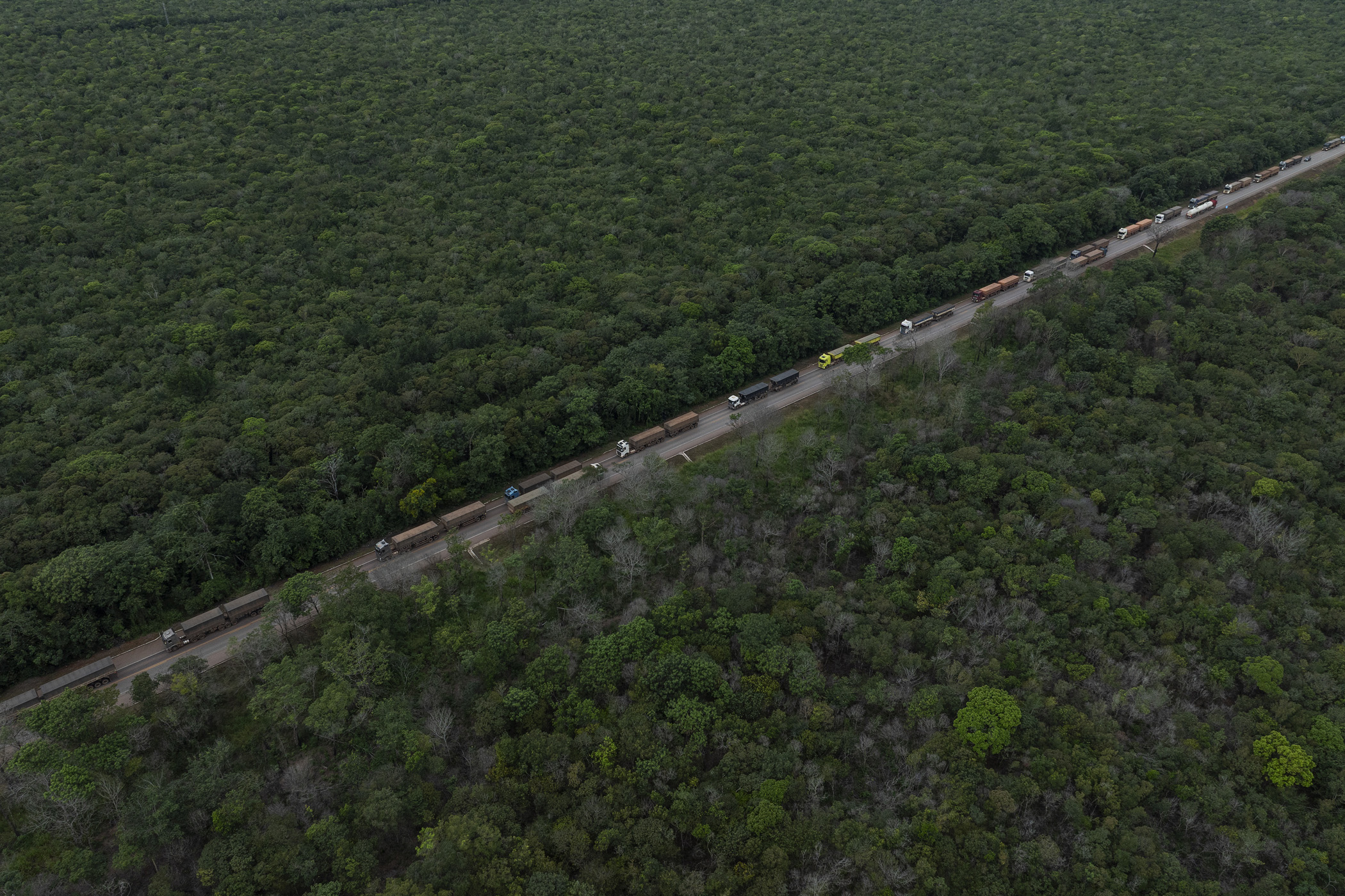 Novo Progresso, Brazil. April 30, 2025. A line of trucks carrying soybeans travels along BR-163 near the Mato Grosso -Pará state border. During harvest season, between 2,000 and 3,000 trucks carrying soybeans travel daily along BR-163 highway between the producing regions in Mato Grosso and the port of Miritituba on the Tapajós River.