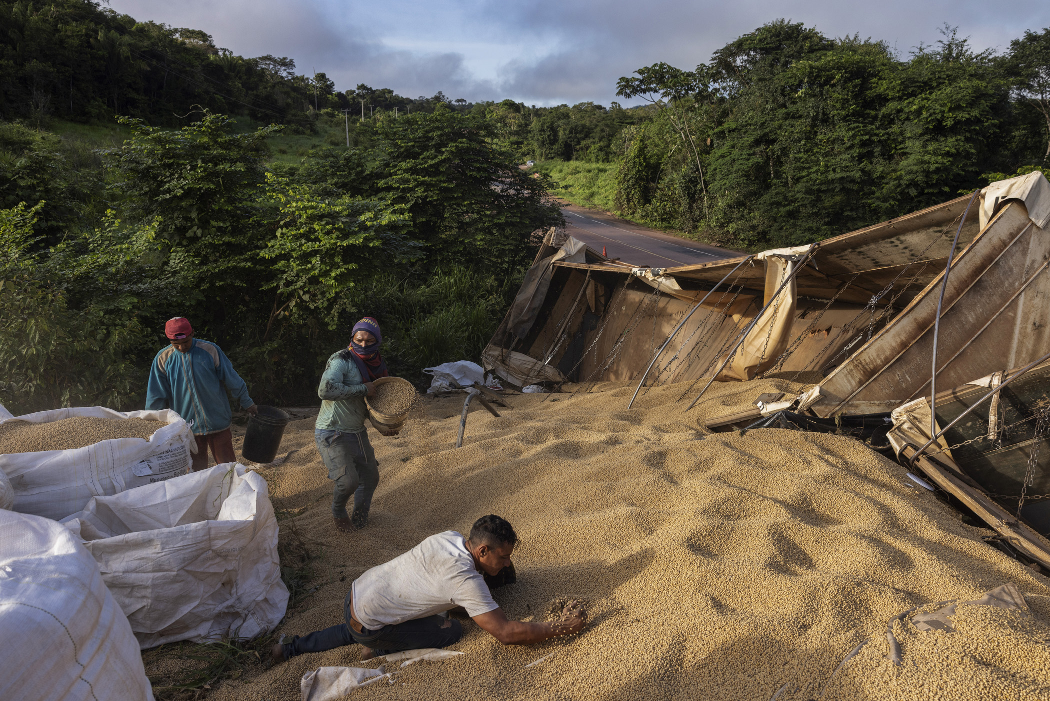 Itaituba, Brazil. May 02, 2025. Workers Carlos Henrique Ramos Silva (white shirt), Daniel Oliveira Ribeiro (shirt on face), Delson Andrew (red cap) collect soybeans from a truck that had an accident on BR-163 highway in the section that crosses the Jamanxim National Park, in Pará The three men make a living recovering cargo from trucks that crash along the BR-163 highway, especially during the soybean harvest period when between 2,000 and 3,000 trucks travel daily along BR-163 between the producing regions in Mato Grosso and the port of Miritituba on the Tapajós River.