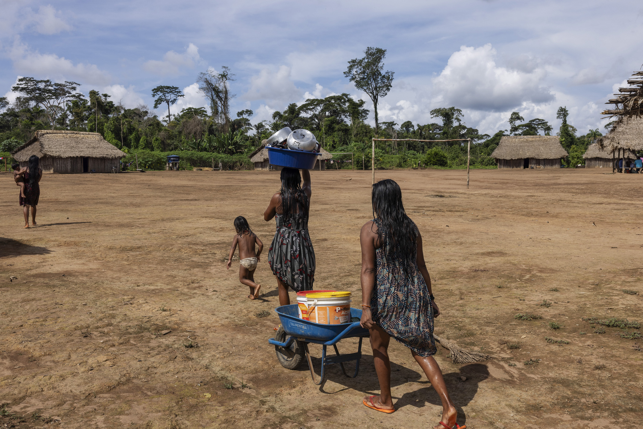 Novo Progresso, Brazil. May 01, 2025. Kayapó women from the Mopkrore village collect water from the Curuaés River, in the Menkragnoti Indigenous Territory in Novo Progresso, Pará. With the prospect of the Ferrogrão construction project, the Indigenous people are already feeling the pressure on their surrounding territory, driven by increased deforestation and the expansion of soybean plantations. For this community, which depends on river water for its survival, contamination from pesticides used in soybean cultivation could have dramatic consequences.