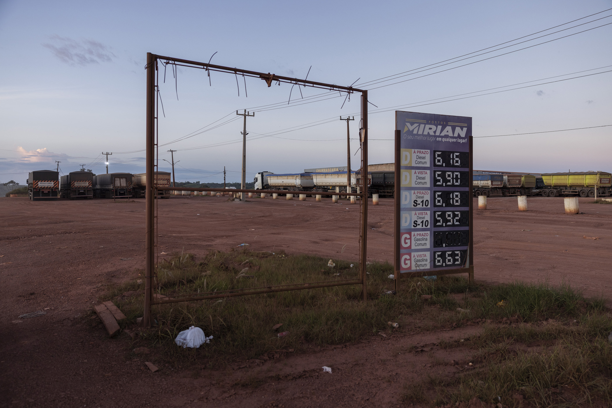Itaituba, Brazil. May 3, 2025. Trucks loaded with soybeans are parked at a gas station at the junction of BR-163 and Transamazônica highways, near Miritituba, Pará. Miritituba will be the final stop of Ferrogrão, a railway that will be used to transport grains from Mato Grosso, the country's main soybean-producing region, to the Tapajós River.