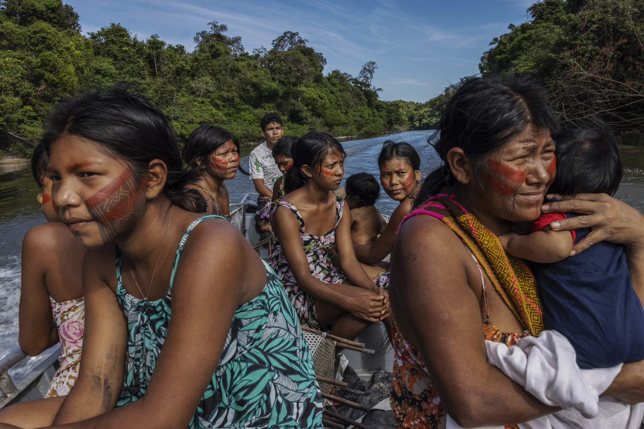 Novo Progresso, Brazil. Kayapó women from the village of Baú travel along a stretch of the Baú River by boat to access the cumaru seeds collecting area in the Baú Indigenous Territory, in southern Pará. The Baú Indigenous Land is the Kayapó territory closest to the Ferrogrão railway planned route, about 30 kilometres away. The Indigenous people are already feeling the impacts of the project on their surrounding territory, such as deforestation and an increase in soybean cultivation.