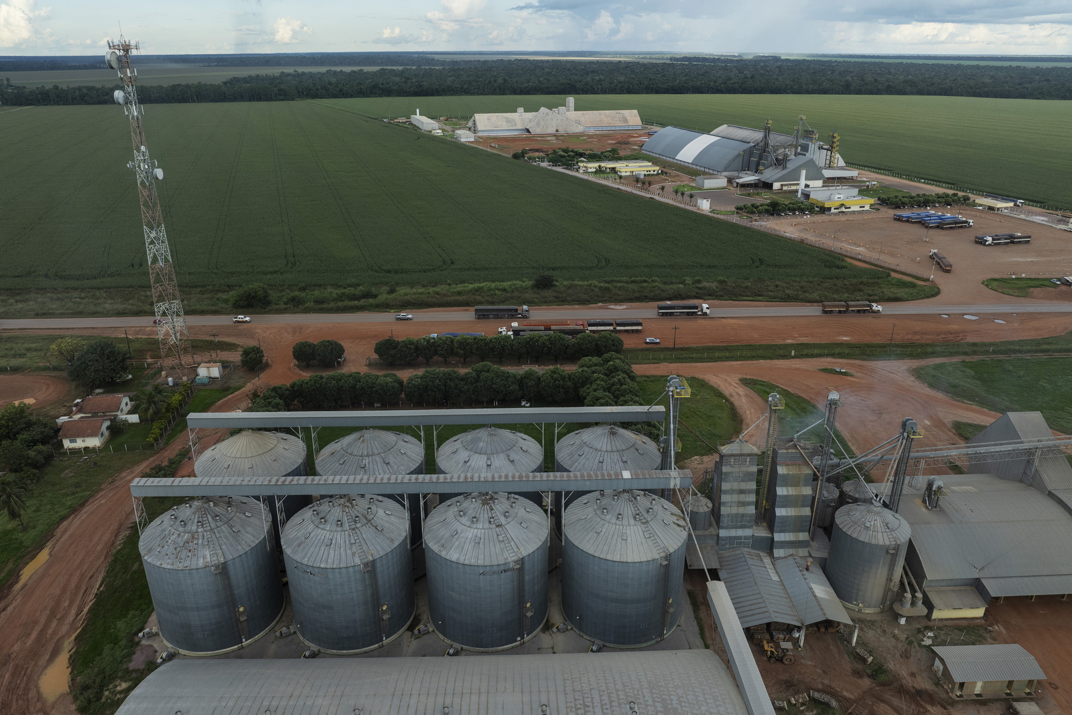 Sinop, Brazil. April 29, 2025. Trucks carrying soybeans travel along the BR-163 highway near Sinop, Mato Grosso. Most of the soybeans produced in this region travel north along the BR-163 highway to the port of Miritituba on the Tapajós River, where the grains are loaded onto barges and transported to the Amazon River, from where they are transported by ship around the world.