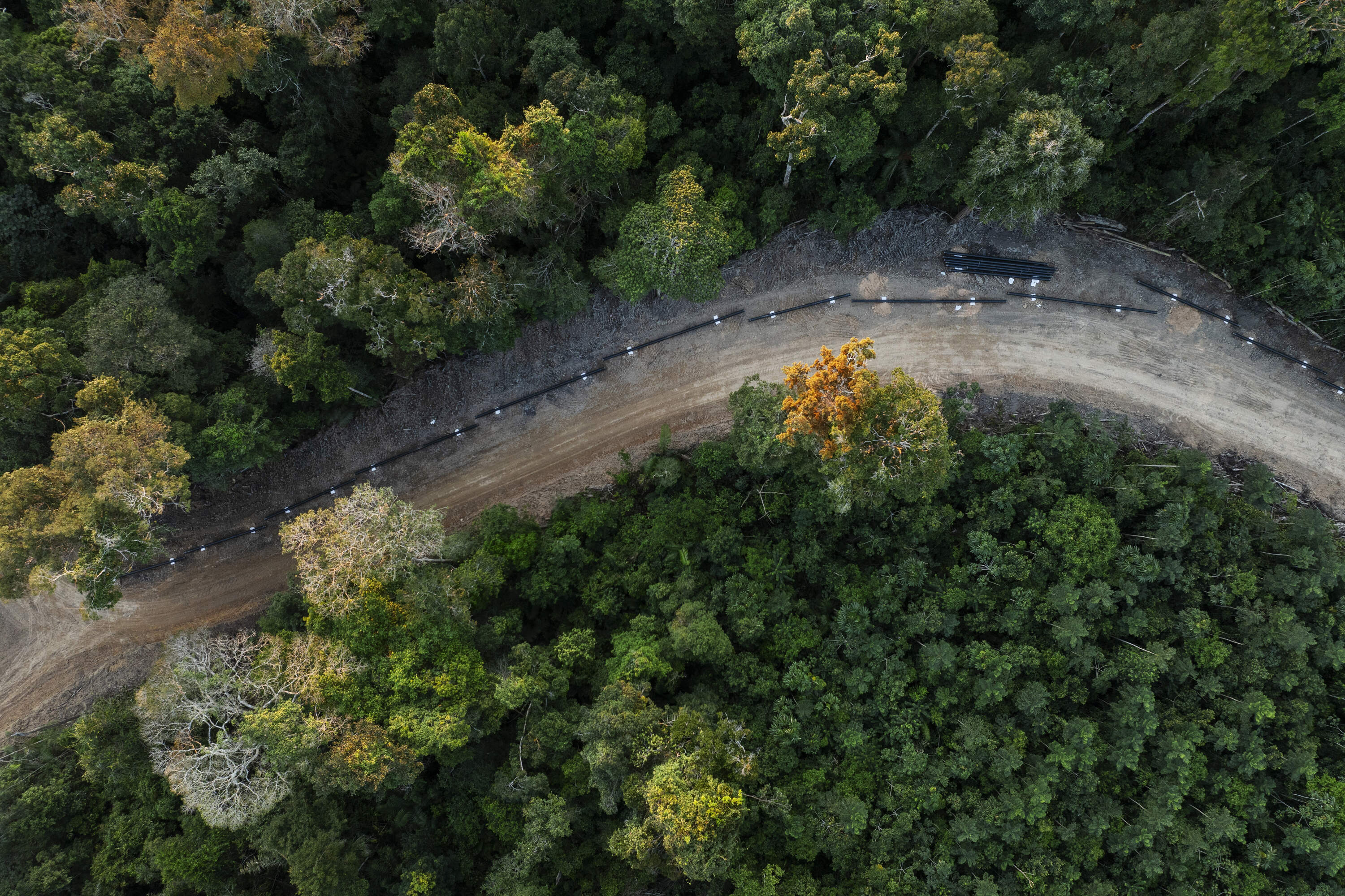 Silves, Brazil. June 23, 2024. Gas pipeline under construction near Eneva's Azulao Gas Treatment Unit located in the municipality of Silves, Amazonas. The expansion of gas through the forest is in full swing, with new wells being drilled for prospecting, pipelines being laid in different parts of the jungle, the gas pipeline taking shape in different sections of the forest, roads being opened for the movement of workers, and the consolidation of the project.