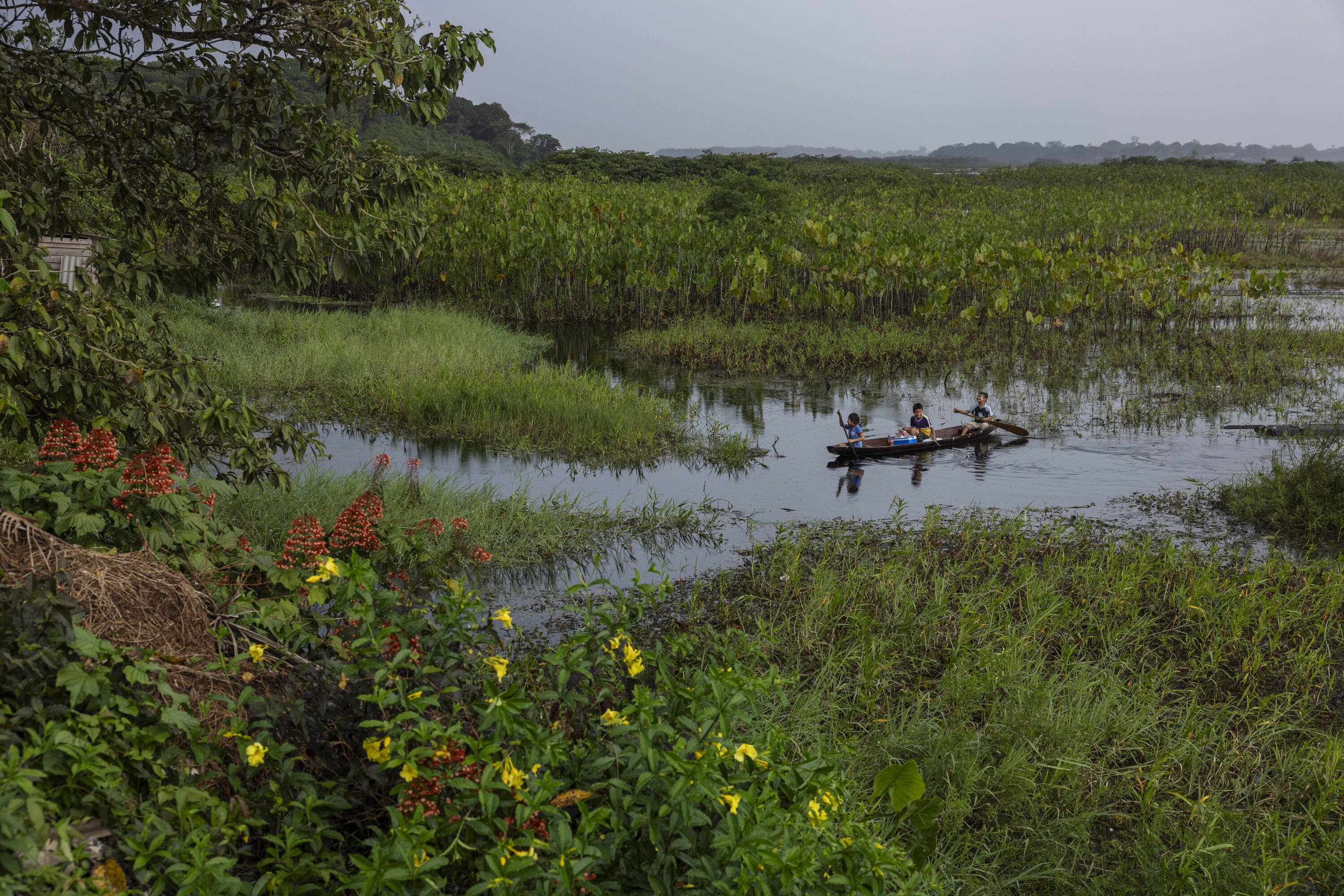Oiapoque, Brazil. Children play in a canoe in front of the village of Santa Isabel in the Uaçá Indigenous Territory, in Oiapoque, Amapá. Around 12,000 indigenous people live in three territories in the Oiapoque region. The oil exploration project in this area of the Brazilian coast puts traditional communities and the environment at risk.