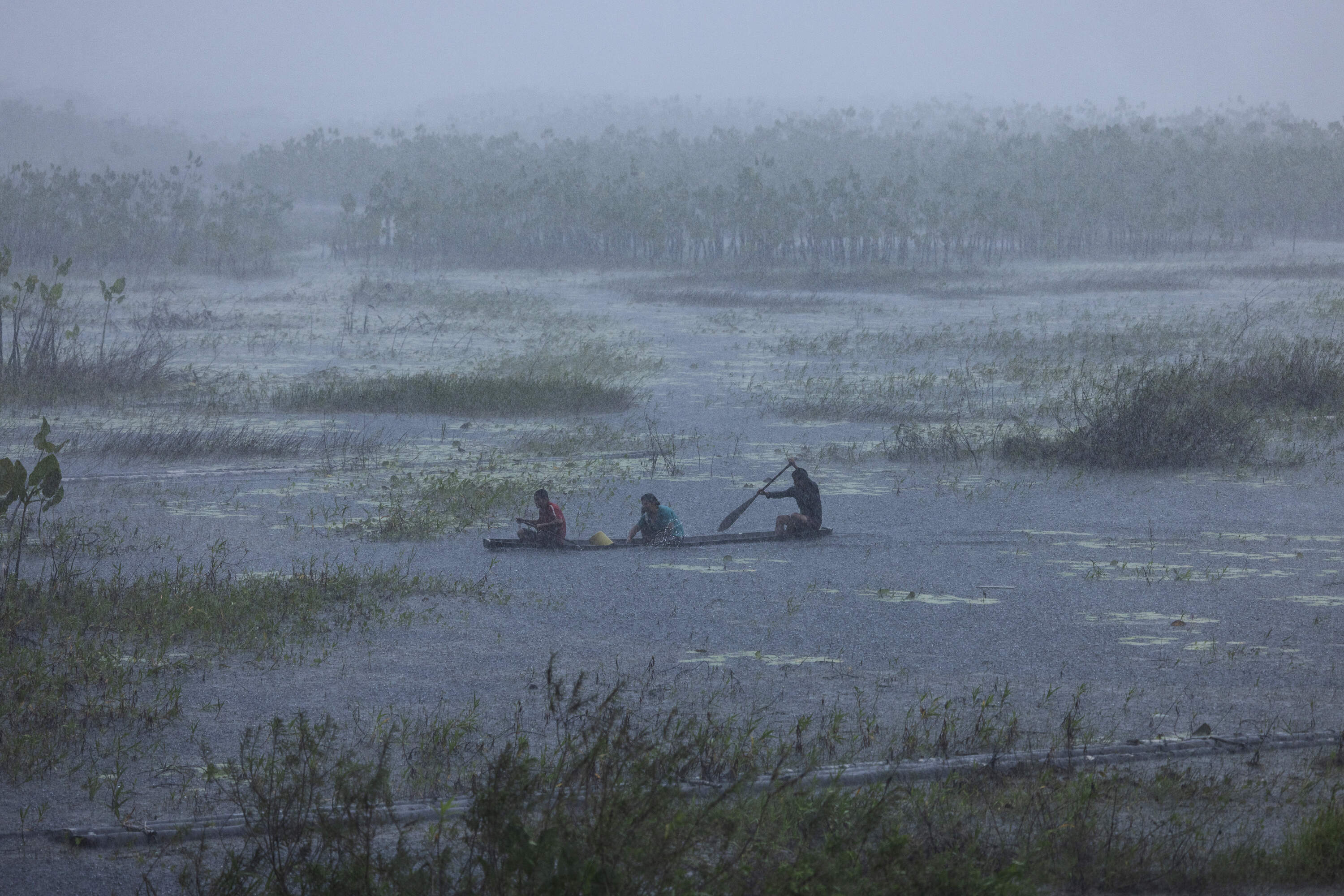 Oiapoque, Brazil. July 26, 2024. Indigenous people row in the rain nearby the village of Santa Isabel in the Uaçá Indigenous Territory, in Oiapoque, Amapá. Around 12,000 indigenous people live in three territories in the Oiapoque region. The oil exploration project in this area of the Brazilian coast puts traditional communities and the environment at risk.