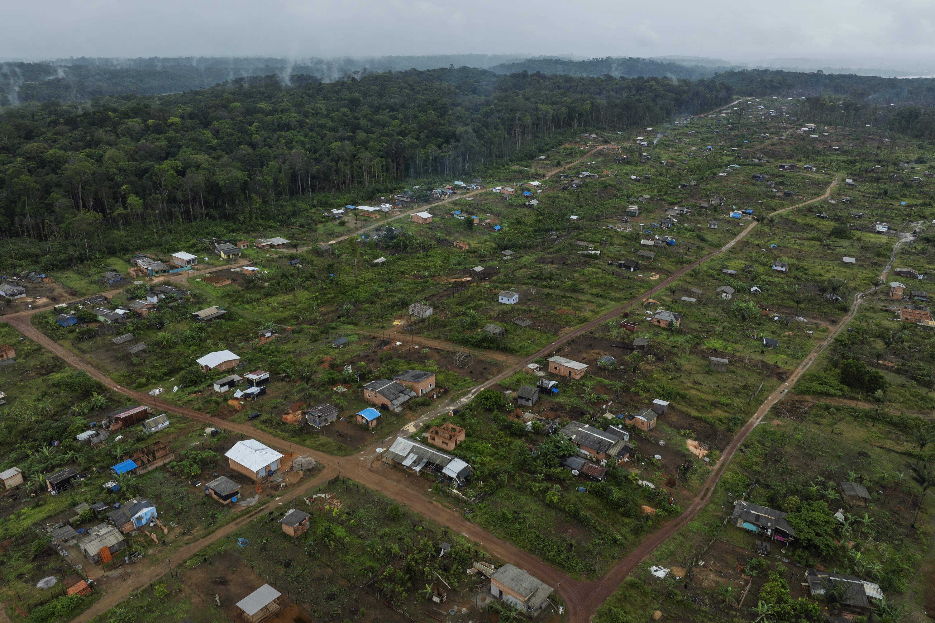 Oiapoque, Brazil. July 25, 2024. Aerial view of the Nova Conquista informal settlement, located on the outskirts of Oiapoque, in Amapá, formed by migrants who recently arrived from the states of Pará and Maranhão. Supported by Lula and politicians of different stripes, oil on the Amazon coast is already causing waves of migration even before any prospecting has taken place. In Oiapoque, migrants from various regions of Brazil, especially Pará and Maranhão, are settling precariously in squatter settlements on the outskirts of the city.