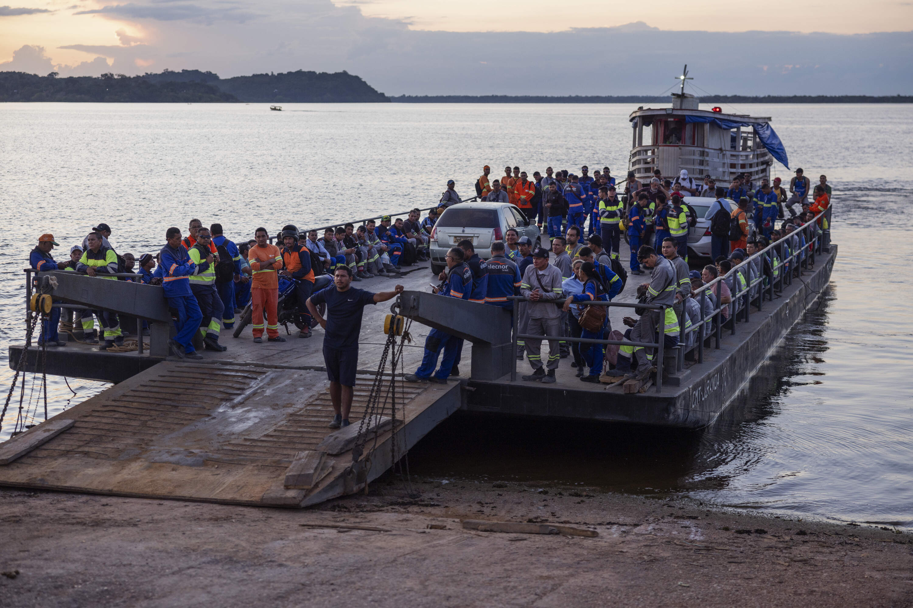 Silves, Brazil. June 27, 2024. Workers involved in the construction of the Azulão field, the main natural gas exploration project in the Amazon, board a ferry to cross from the city of Silves (located on an island) to their workplace. The expansion of gas through the forest is in full swing, with new wells being drilled for prospecting, pipelines being laid in different parts of the jungle, the gas pipeline taking shape in different sections of the forest, roads being opened for the movement of workers, and the consolidation of the project.