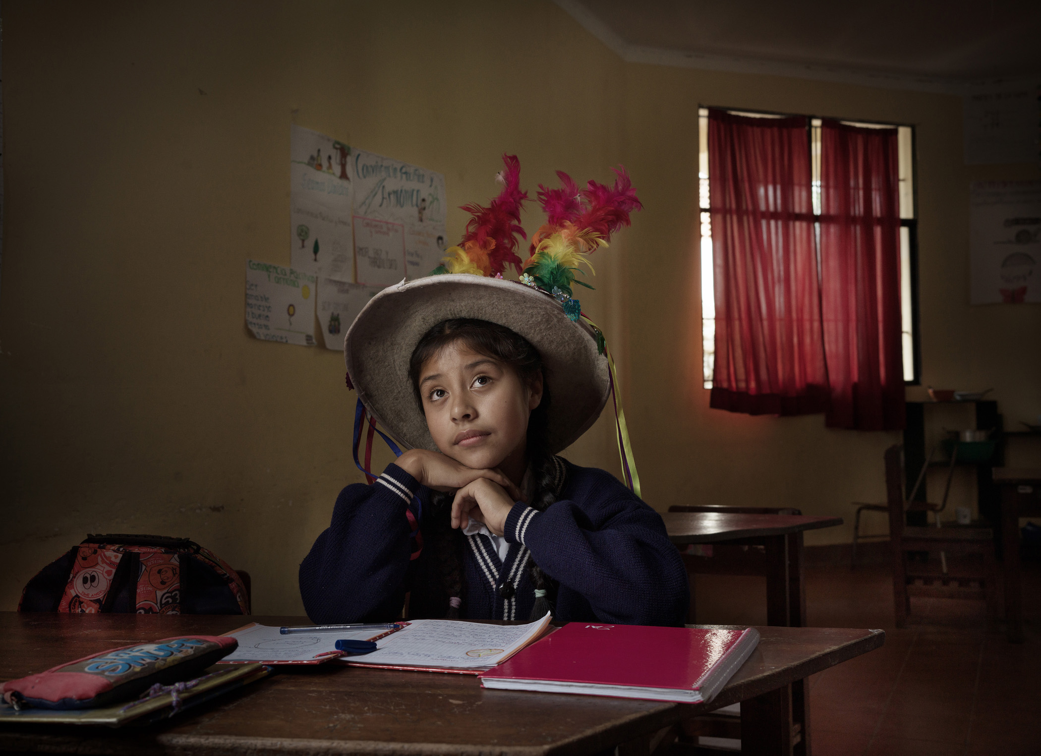 risks she faces on her daily journey. She pictures herself performing on a stage. “I hope to be in a ballet,” she says. “When we dance at school, I wear this hat. I feel relaxed when dancing.” School is a place where Violeta feels secure and happy.